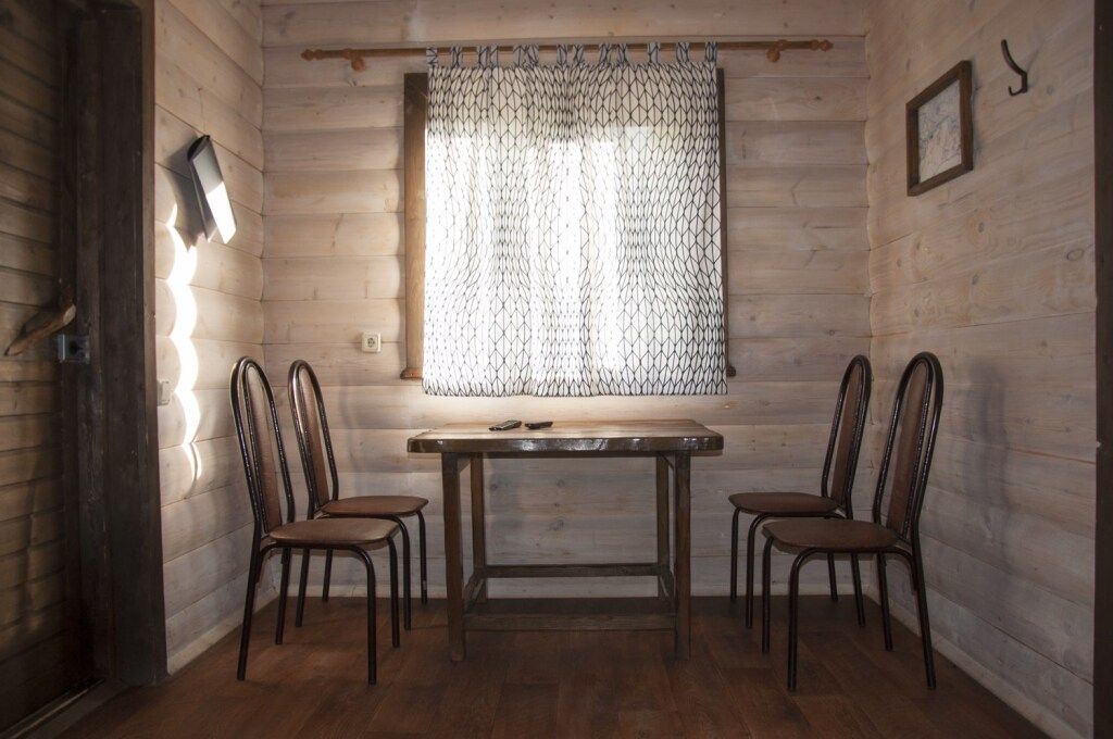 Гостиная зона – это деревянные стол, стулья и умывальник. Гостиная оснащена, мини-холодильником, электрическим чайником и микроволновой печкой.