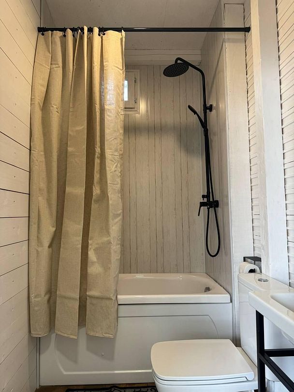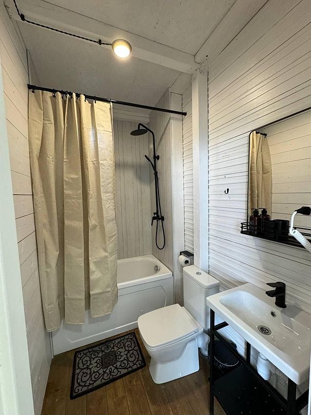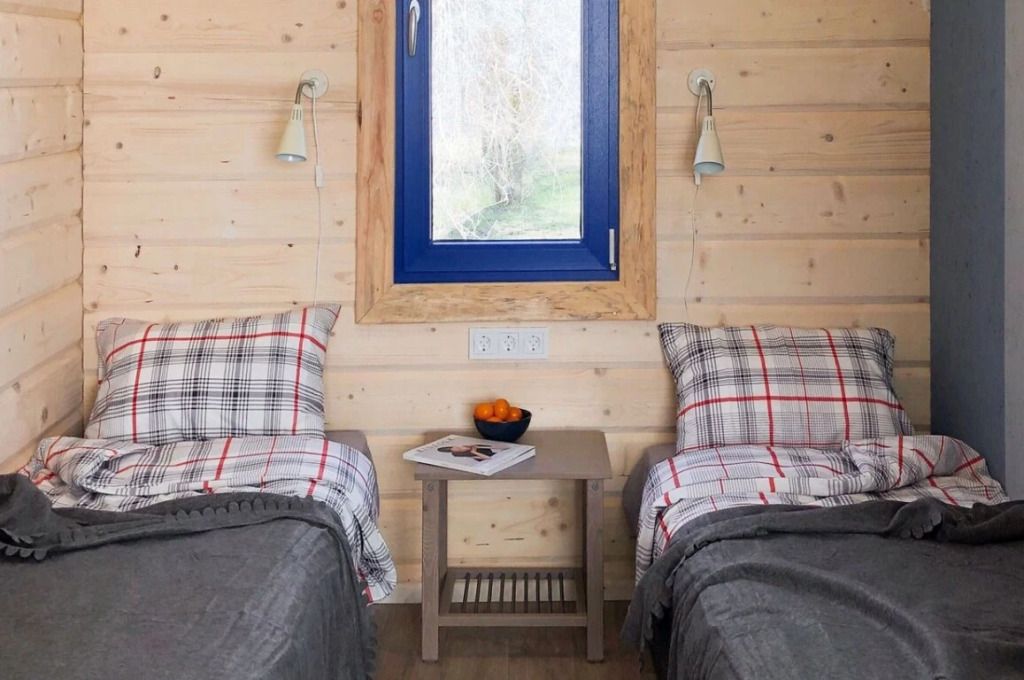 Дом на троих представляет собой гостевой дом, вместимостью до 3-х человек. В каждом домике есть две односпальные кровати, зона гостиной с дополнительным спальным местом, санузел.