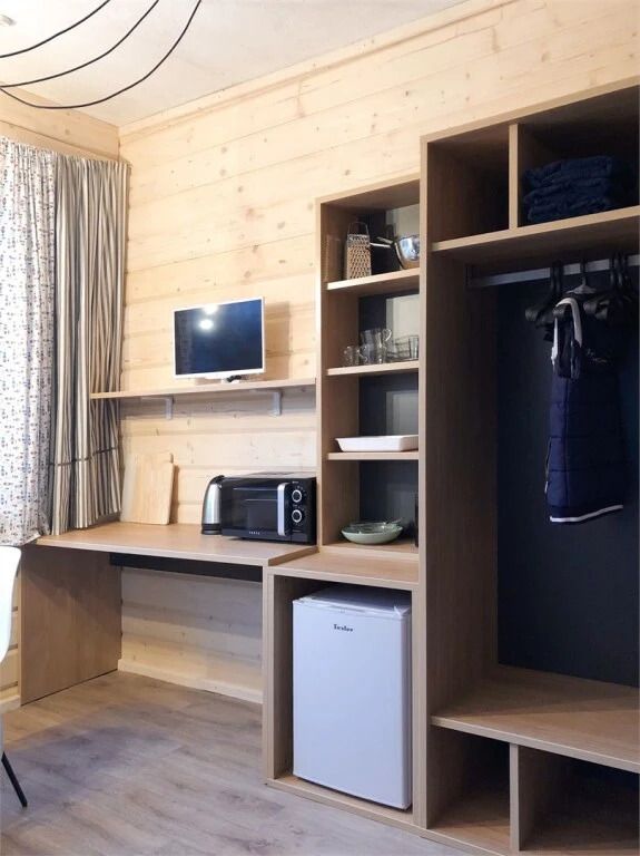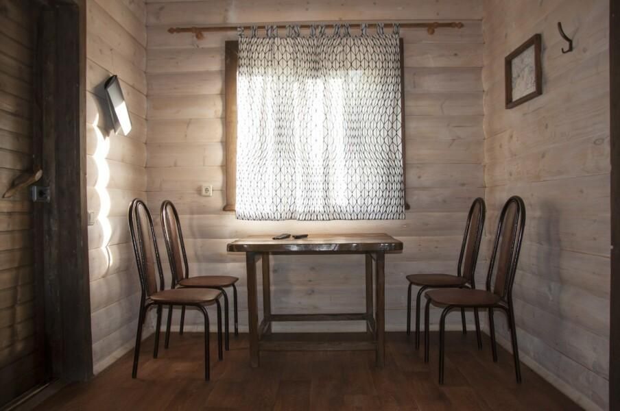 Гостиная зона — это деревянные стол, стулья и умывальник. Гостиная оснащена, мини холодильником, электрическим чайником и микроволновой печкой.