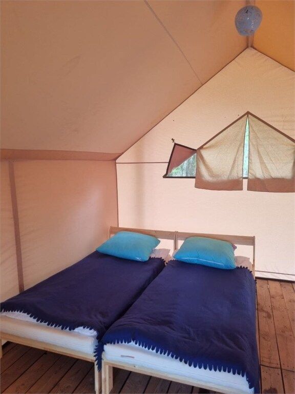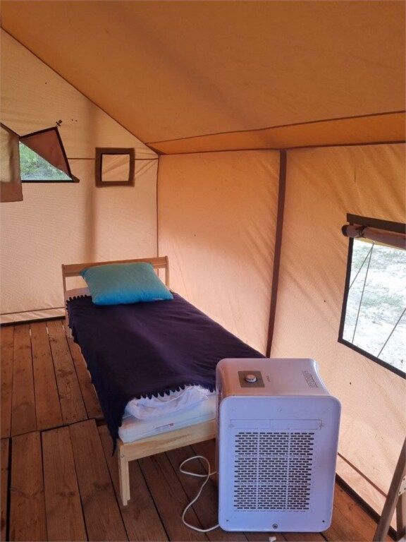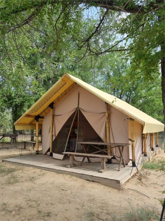 Просторный сафари тент (24 кв. м.) из бруса и смесовой ткани с надежной крышей из качественного немецкого ПВХ. Аккуратно вписанные в ландшафт домики установлены на больших деревянных подиумах, которые минимизируют проникновение холода от земли внутрь.