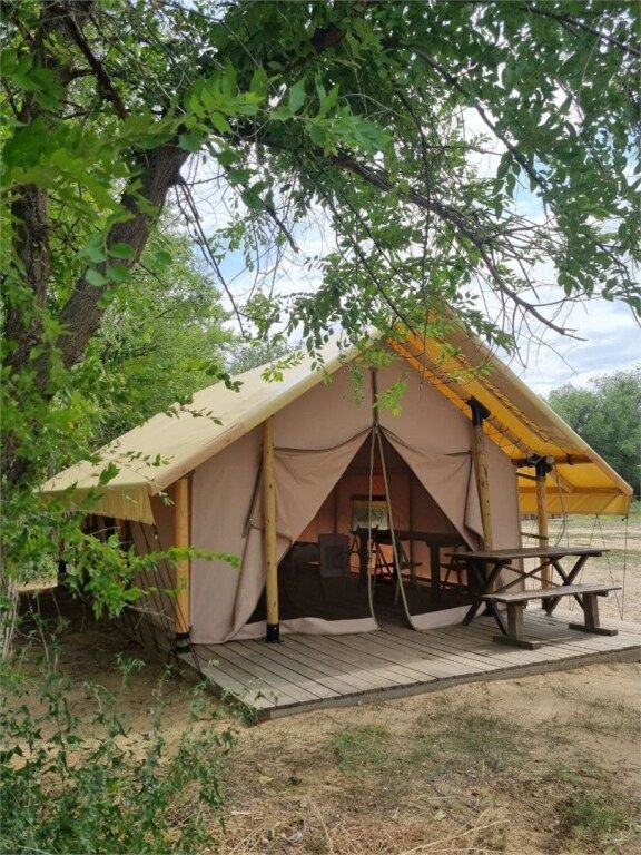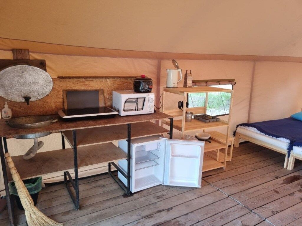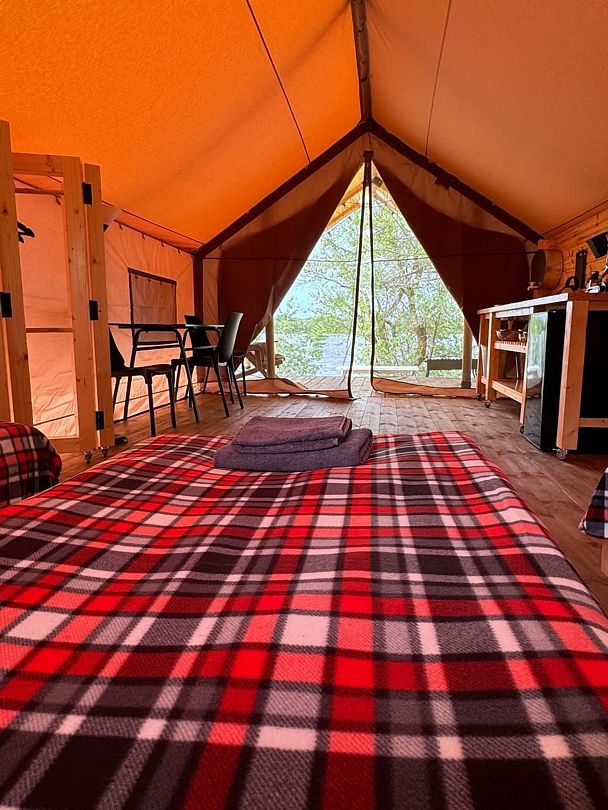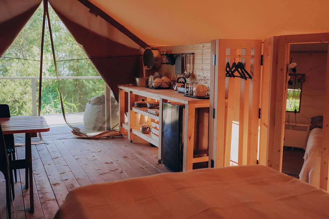 Остановившись в роскошном кемпинге, вашим жильем будет просторный сафари тент (24 кв. м.) из бруса и смесовой ткани с надежной крышей из качественного немецкого ПВХ. Аккуратно вписанные в ландшафт домики установлены на больших деревянных подиумах, которые минимизируют проникновение холода от земли внутрь.