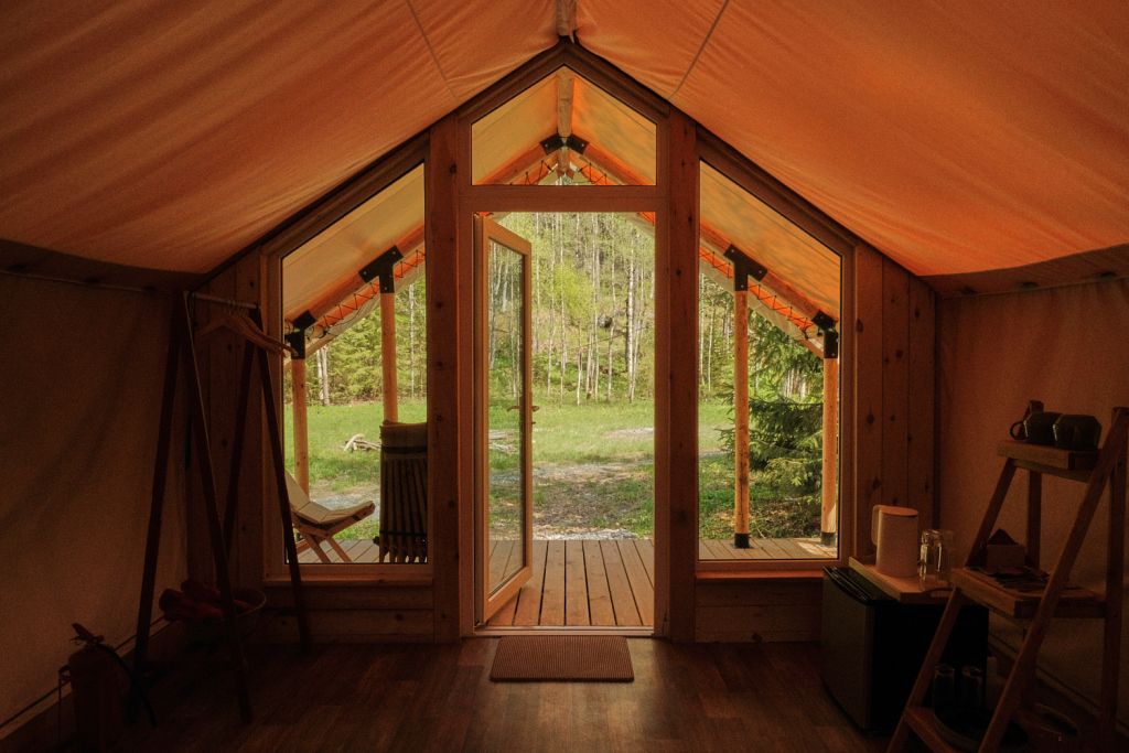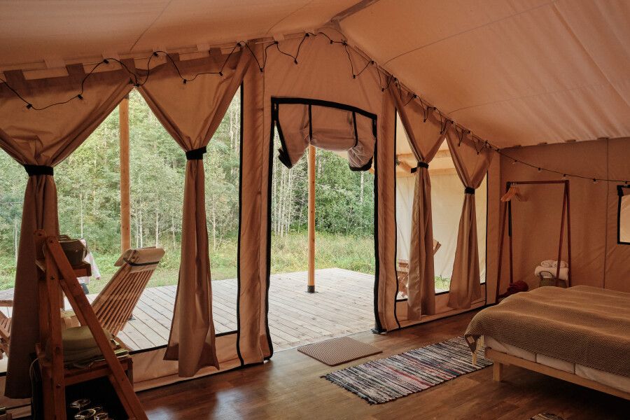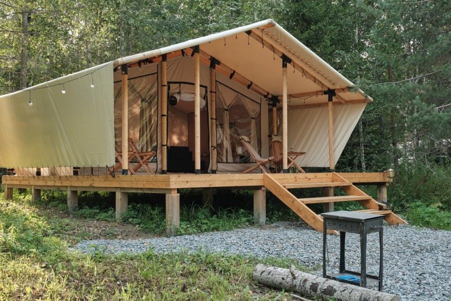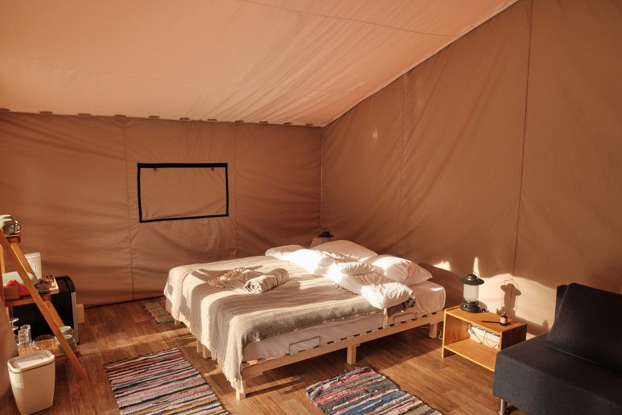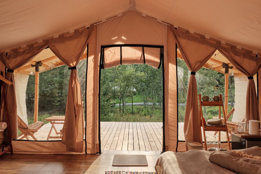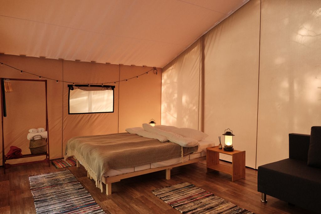 На территории находится девять стандартных сафари-тентов с теплыми полами и живописными видами. В мае и сентябре открываются три стандартных номера и покрываются специальным одеялом для палаток. За счет этого внутри палатки комфортно даже при минусовой температуре.