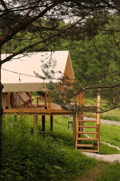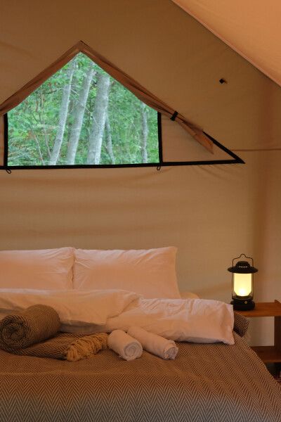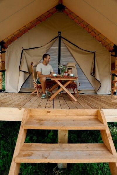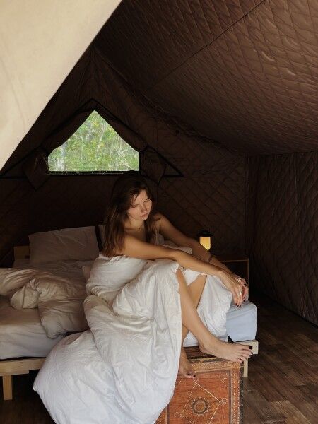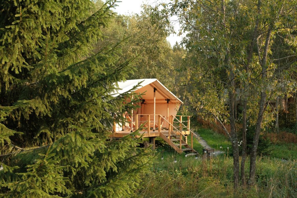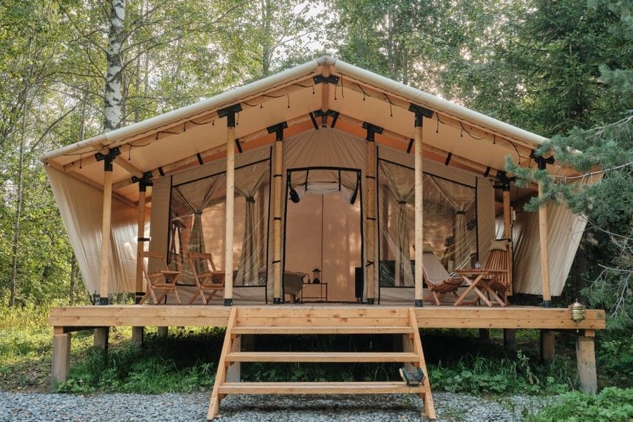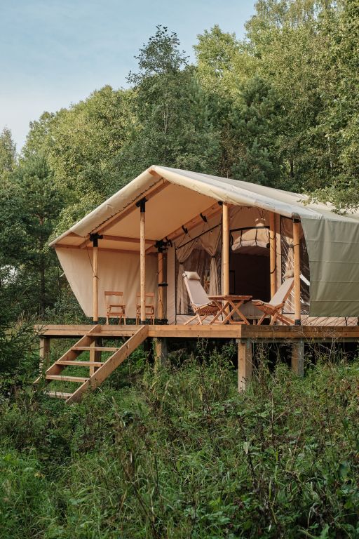 Уединенные сафари-тенты с панорамной входной зоной, теплыми полами и видом на лес. Максимальная вместимость номера: трое взрослых и один ребенок до пяти лет без спального места (завтрак для ребенка оплачивается отдельно). Завтрак в кафе уже включен в стоимость.