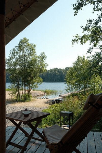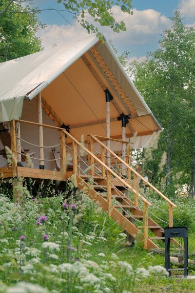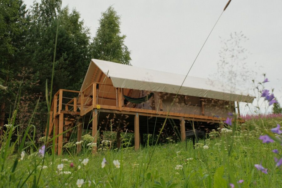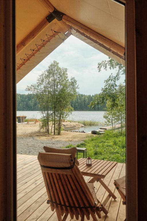 Сафари-тенты с панорамной входной зоной на первой линии озера, собственным санузлом и горячим чаном на террасе. В мае и сентябре можно любоваться перелетными птицами на озере, а летом купаться. Сафари-тент с теплыми полами и утеплён сверху одеялом, поэтому находится внутри тепло даже при минусовой температуре.