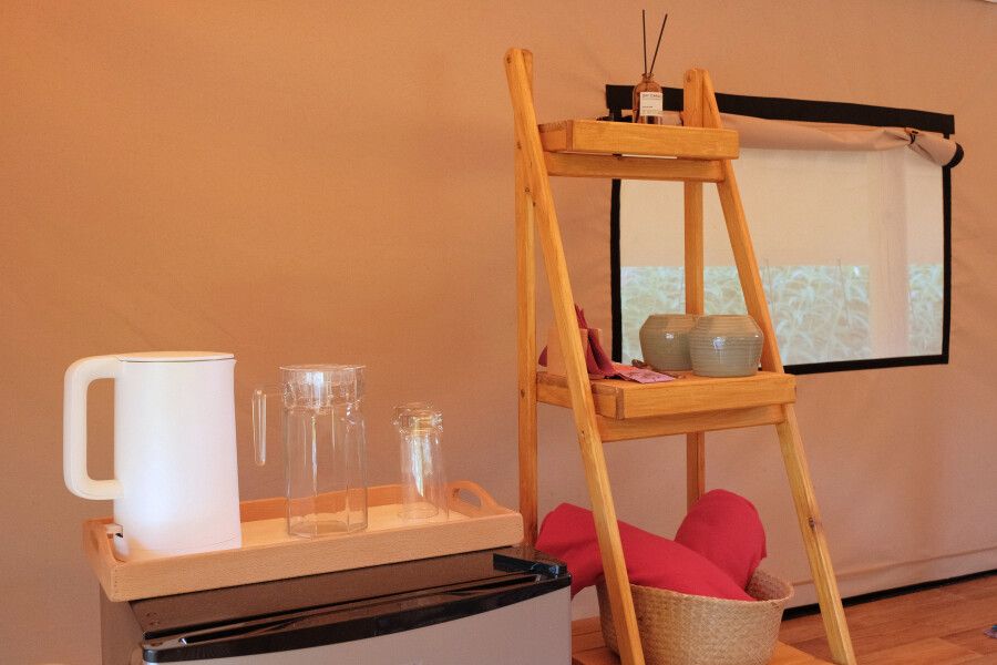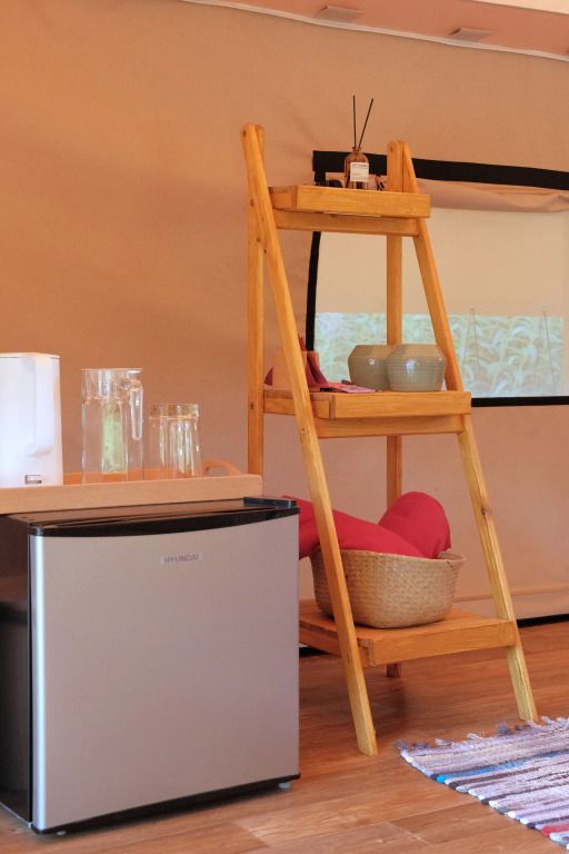Каждый сафари-тент в глэмпинге оснащен персональным мангалом, позволяющим гостям готовить на открытом огне. Гостям предоставляются решетки, шампуры и вертел, чтобы создать незабываемые гастрономические впечатления под звездным небом.