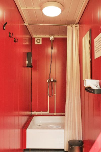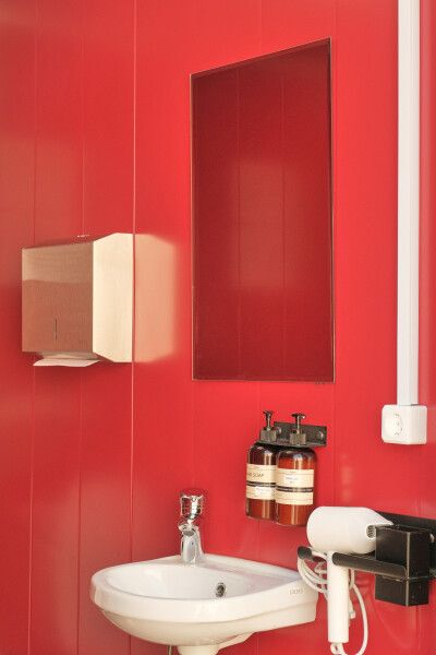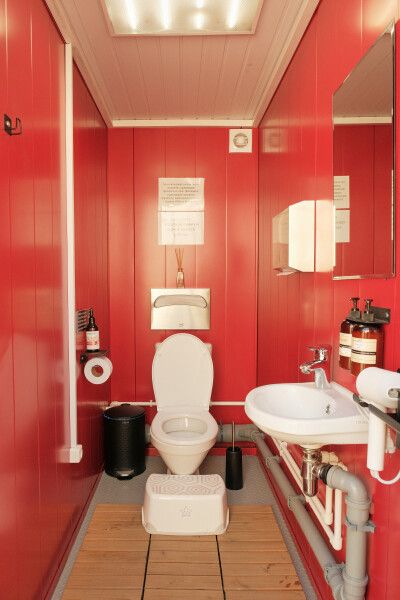 Отапливаемые удобства и душевые с горячей водой доступны круглосуточно и являются общими для всех гостей (расстояние от ста до трехсот метров). Четыре санузла с раковиной, мылом, зеркалом и диффузором; четыре душевые комнаты с горячей водой (круглосуточно), оборудованные органической косметикой (шампунь, бальзам для волос, гель для душа); фен предоставляется по запросу.