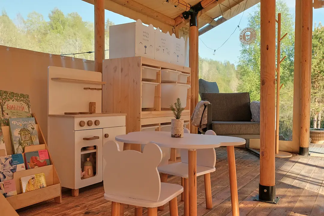 В кафе глэмпинга создан уютный уголок для детей, где юные гости могут весело проводить время, играя с игрушками, наслаждаясь настольными играми с родителями и читая детские книжки. Это идеальное место для развлечений и творчества в семейной атмосфере.