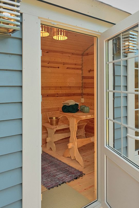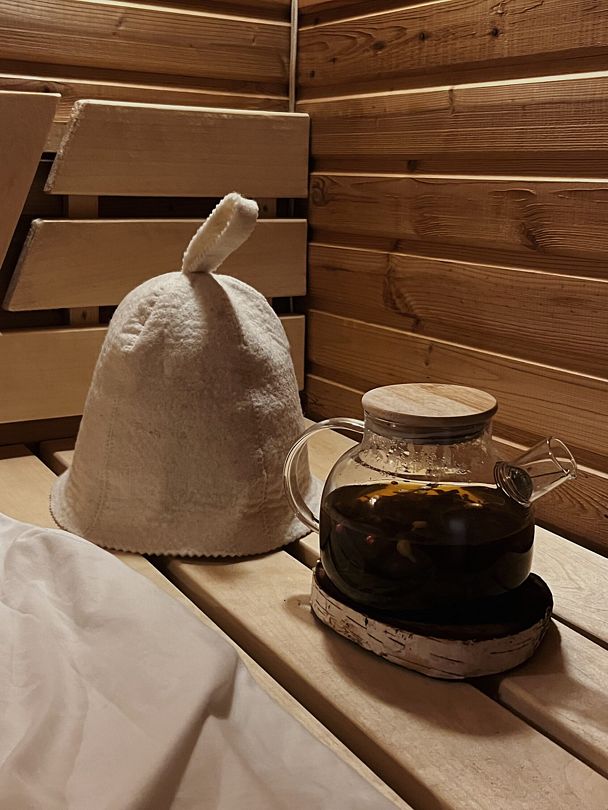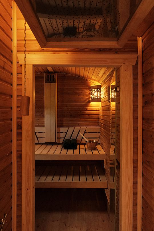 Финская сауна на дровяной печи создана для уютного отдыха двух взрослых или пары с детьми. Гостей ждут мягкие халаты, ароматный чай из самовара и свежие полотенца, создавая атмосферу домашнего тепла и комфорта.