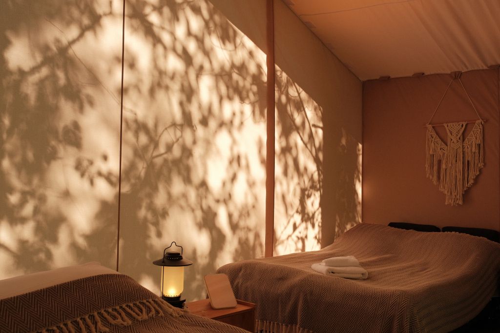Сафари-тент с теплым полом на возвышении и лесной горячий чан. Внутри расположили двухспальную кровать 160×200 см с теплой электропростынью, ортопедическим матрасом и белоснежным сатиновым бельем.