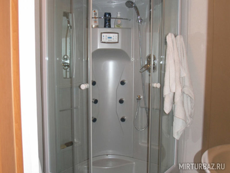 2 двухспальные кровати, кресла, диван, телевизор, санузел, душевая кабина, фен, чайник, чайный сервиз, холодильник