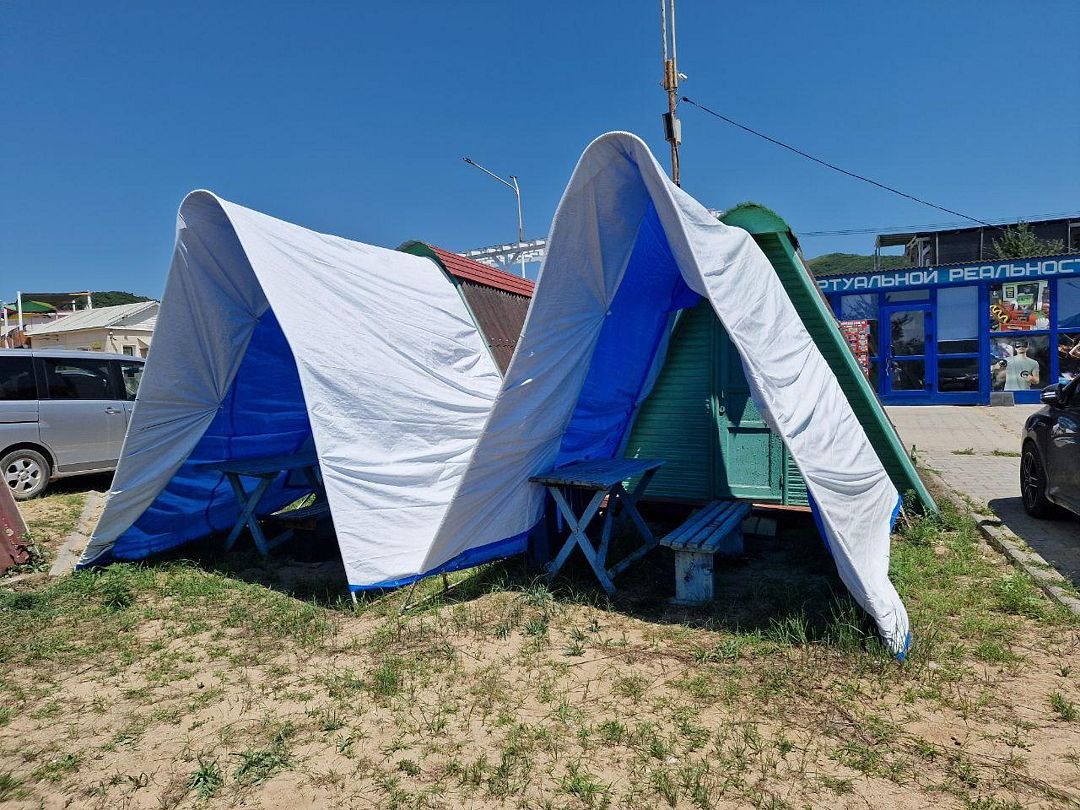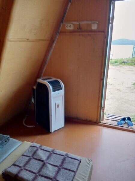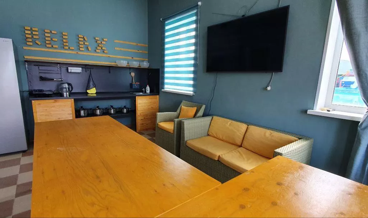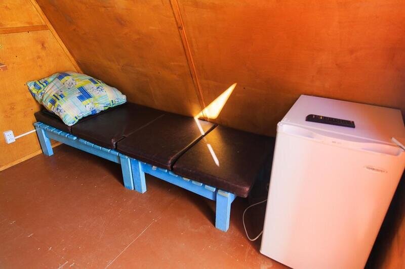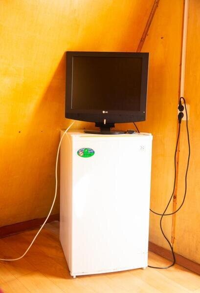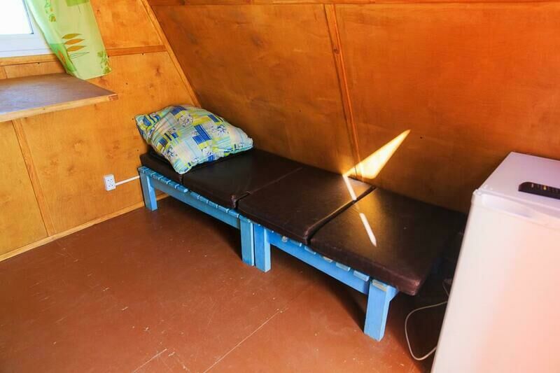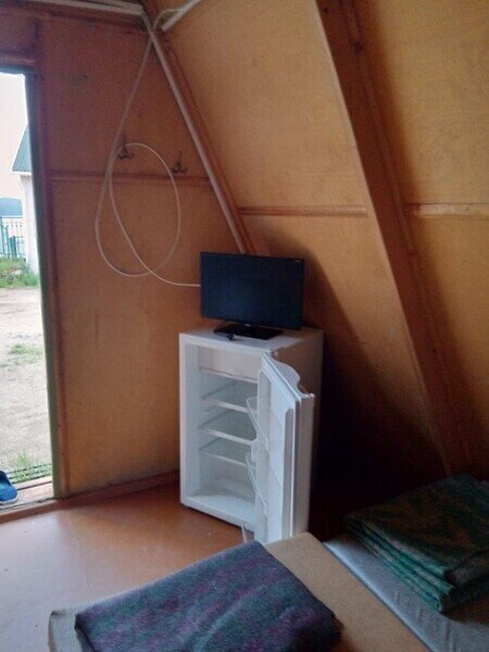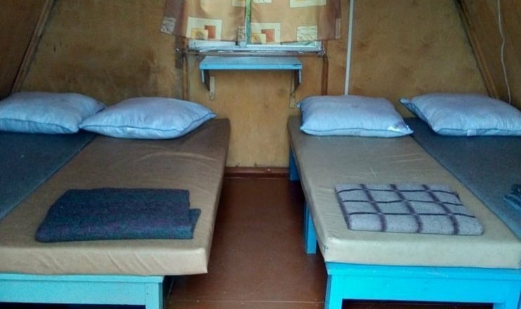 два спальных места, стационарное электропитание, телевизор, холодильник, тент, деревянный столик и скамейка. Постельное белье, полотенца, баллон с газом для плитки не выдаются.
