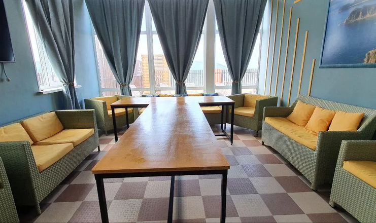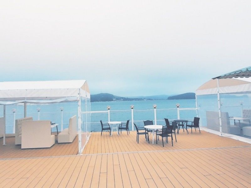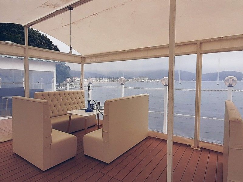 Рабочий день начинается с 17:00 часов вечера и до последнего клиента. Отдохнуть можно как в большой компании на мягких бежевых диванчиках, так и провести время с близким человеком, наслаждаясь видом на вечерний закат и японское море. В кафе играет Диджей, который создает для всех гостей атмосферу праздника и незабываемой вечеринки, а по выходным вас порадует живая музыка.
