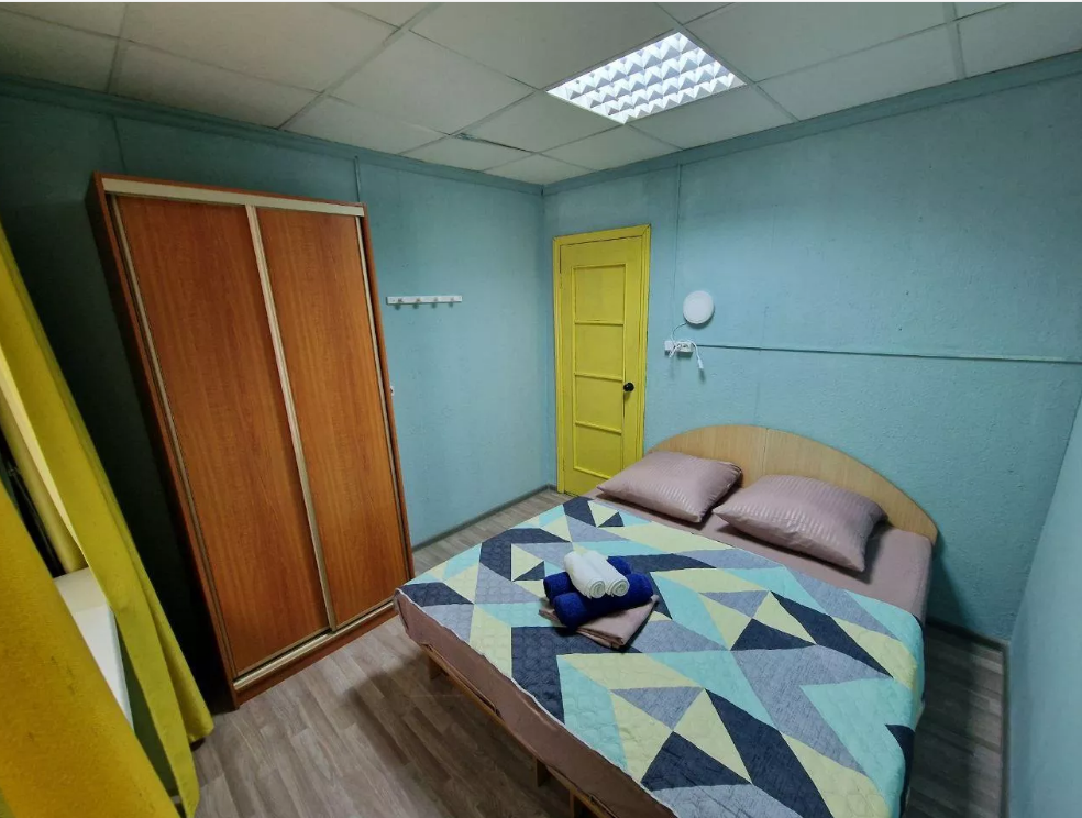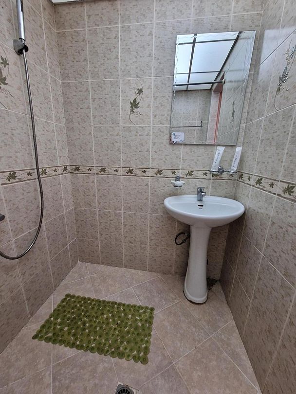 двуспальная кровать, телевизор, холодильник, кондиционер, общая гостиная с кухней, 2 туалета и 1 душ с расчетом на 6 номеров. Вид во двор