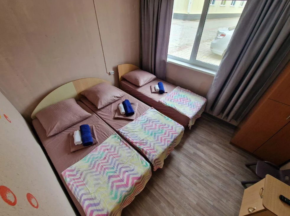 двуспальная кровать и две односпальные кровати, телевизор, холодильник, шкаф, туалет и душ находятся на этаже номера