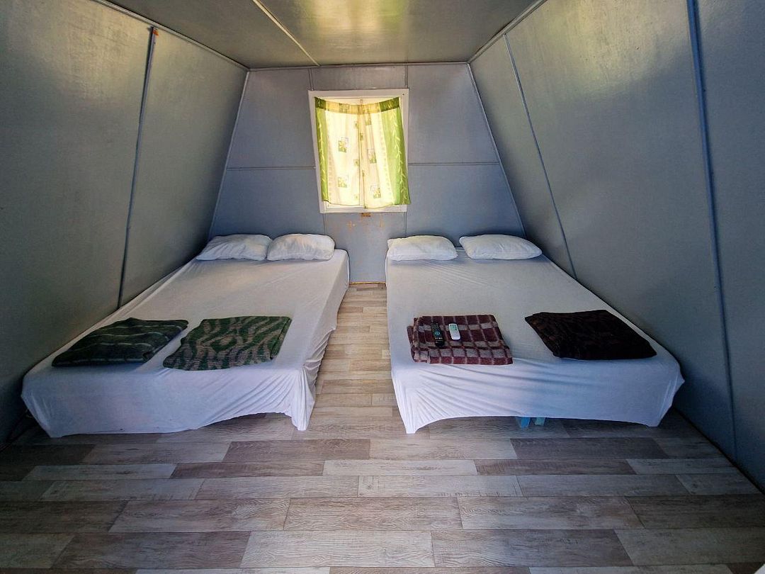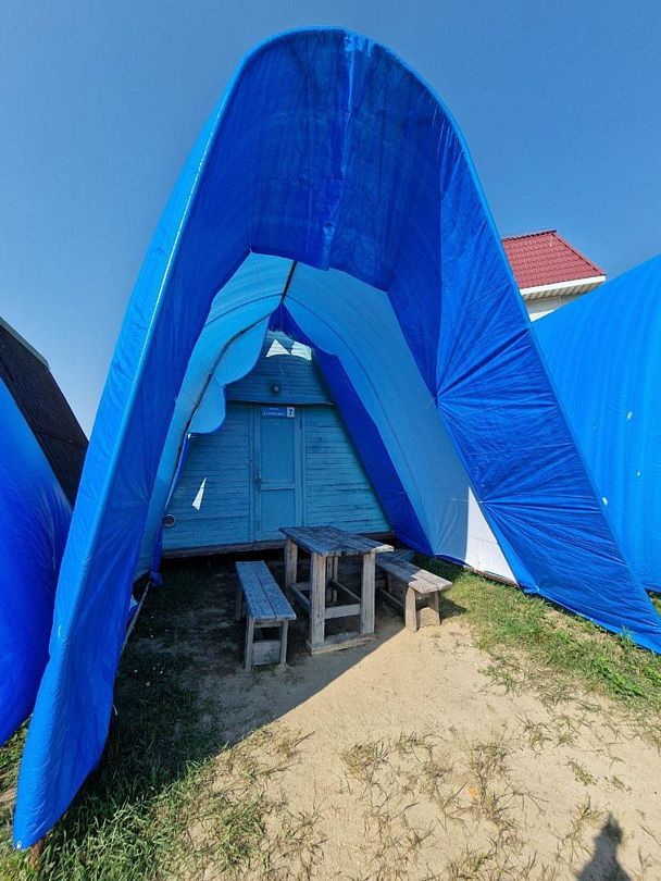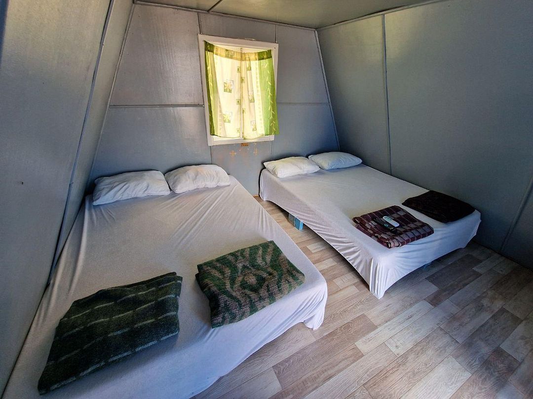2спальн. и 1спальн. кровати, стационарное электропитание, телевизор, холодильник, тент на улице, деревянный столик и скамейка. Постельное белье, полотенца, баллон с газом для плитки не выдаются.