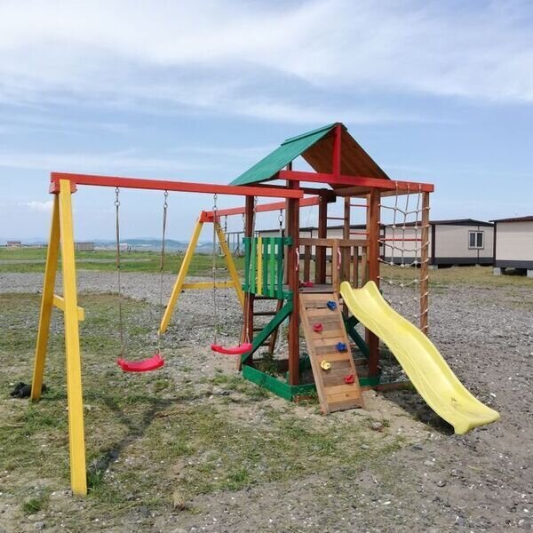 две односпальные кровати, одна двуспальная кровать, стол и четыре стула, вешалка для одежды, лампы, вентилятор, холодильник, телевизор. Туалеты и душевые кабины расположены на территории. Постельное белье не предоставляется.