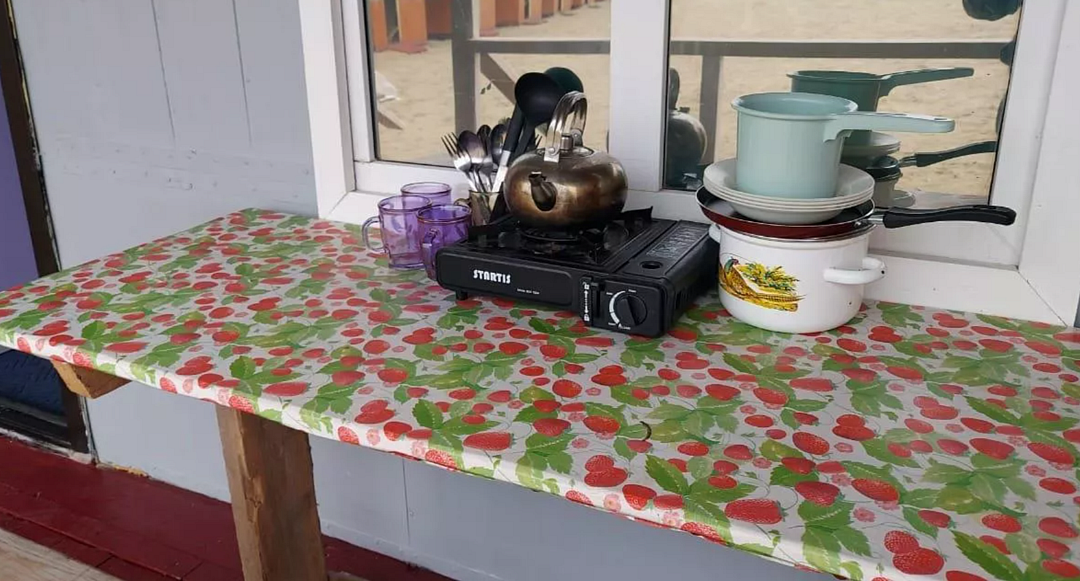 В каждом домике есть двуспальная и односпальная кровати, зеркало, столик, вешалка для одежды, постельное белье, посуда (стаканы, тарелки, ложки, вилки, нож, кастрюля, сковорода), газовая плита (баллоны можно привезти с собой или приобрести в магазине на базе), и холодильник. Также рядом с каждым домом есть летняя кухня для приготовления пищи (стол, лавочки, полочки).