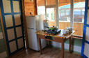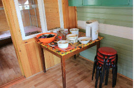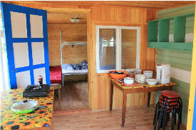 В домике есть: полный набор посуды для 5-ти человек, холодильник, газовая плита, поттер, 1 односпальная кровать, 1 двухъярусная кровать, 1 двуспальная кровать, стеллаж, постельное белье, легкие пледы, подушки, стол и стулья, умывальник на веранде. Туалет/душ на территории.