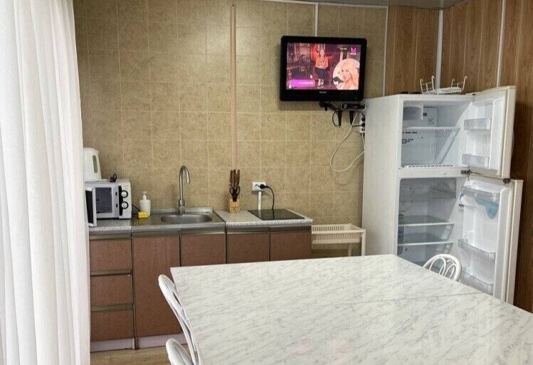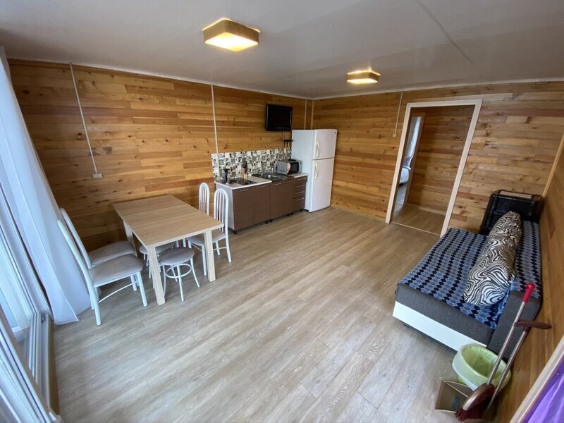 кровати: 1-спальные / 2-спальные, холодильник, электрическая плита, микроволновая печь, комплект посуды, кухонные и обеденные столы, стулья, диван, с/у с душ. каб