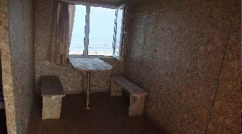 - Обеденная зона включает в себя столешницу с раковиной для приготовления еды, газовую плиту и холодильник. Отдельно стоит стол со стульями. Посуда выдается по требованию бесплатно.