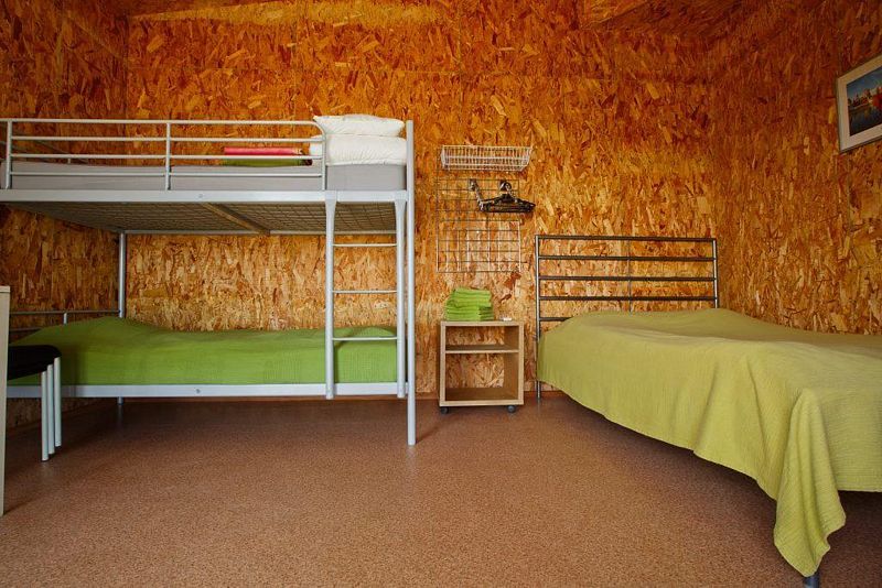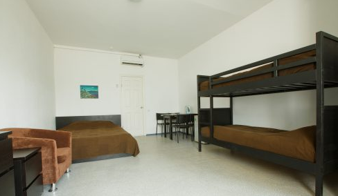 Номера 4х местные (кондиционер, холодильник, чайник, накопительный электрический бойлер, душ, туалет, раковина,одна двуспальная кровать, одна двухэтажная кровать, стол + стулья, тумбочка, вешалка).