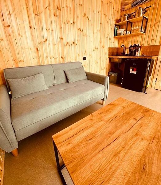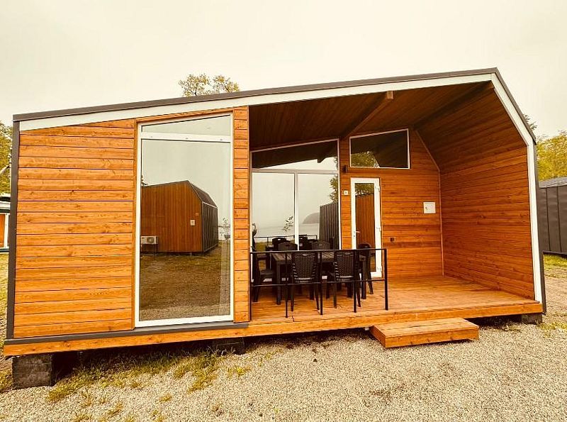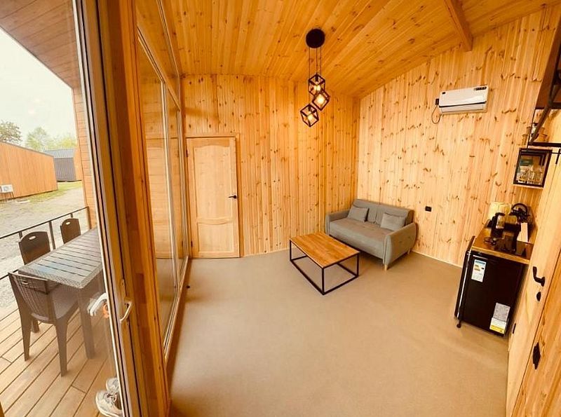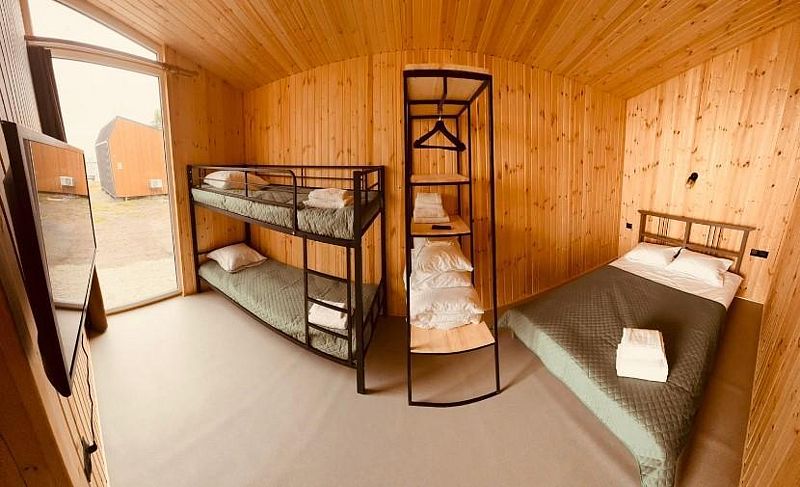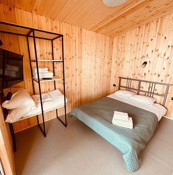 Домики "Каюта" (душ, раковина, туалет, холодильник, чайник, вешалка, вентилятор, одна двуспальная кровать, одна односпальная кровать-диван, шкаф для одежды).