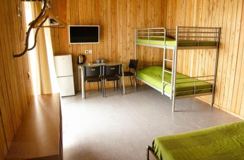 Номера 4х местные увеличенные (кондиционер, холодильник, чайник, накопительный электрический бойлер, душевая кабина, туалет, раковина,одна двуспальная кровать, одна двухэтажная кровать, стол + стулья, тумбочка, вешалка, шкаф для одежды).