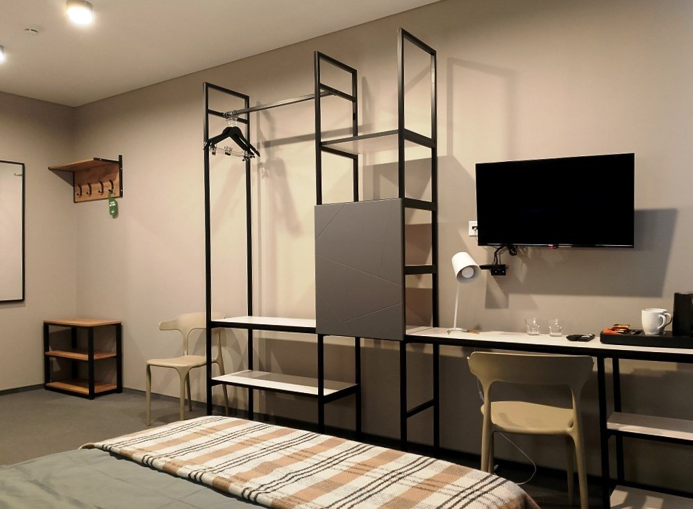 Wi-Fi, светильник, настольные лампы, фен, электронные замки, санузел, теплый пол, банные полотенца, две односпальные или большая двуспальная кровать, диван, стулья, вешалки, журнальный столик, зеркало, мебельный гарнитур, чайный набор, информационная карта, меню, сейф, чайник, унитаз, раковина, ковровое покрытие, отопление, душ, вид на город, стул, туалетные средства, туалет, внутренний телефон, телевизор с плоским экраном, мини-холодильник, кухонный уголок, рабочий стол, можно с питомцамиВ гостиничном номере