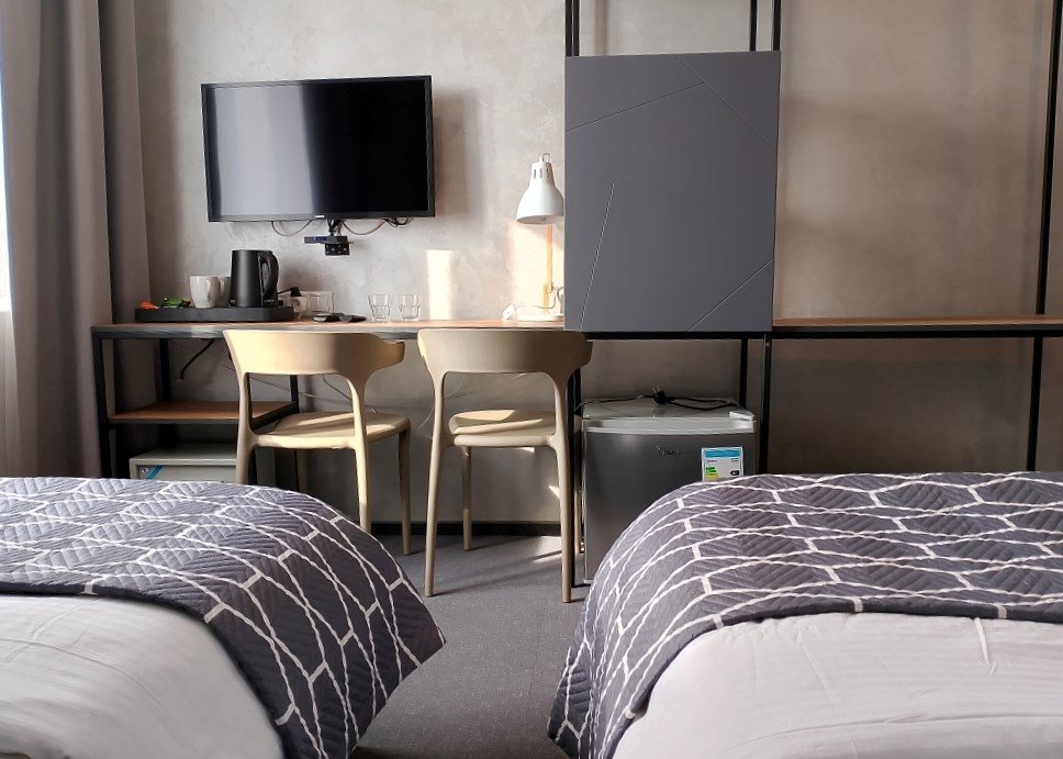 Wi-Fi, светильник, настольные лампы, электронные замки, теплый пол, банные полотенца, две односпальные кровати, зеркало, сейф, унитаз, раковина, ковровое покрытие, отопление, душ, вид на город, стаканы, стул, тумба, туалетные средства, внутренний телефон, телевизор с плоским экраном, мини-холодильник, рабочий стол, чайная станция, уборка номера, вешалки-плечики, можно с питомцамиВ гостиничном номере