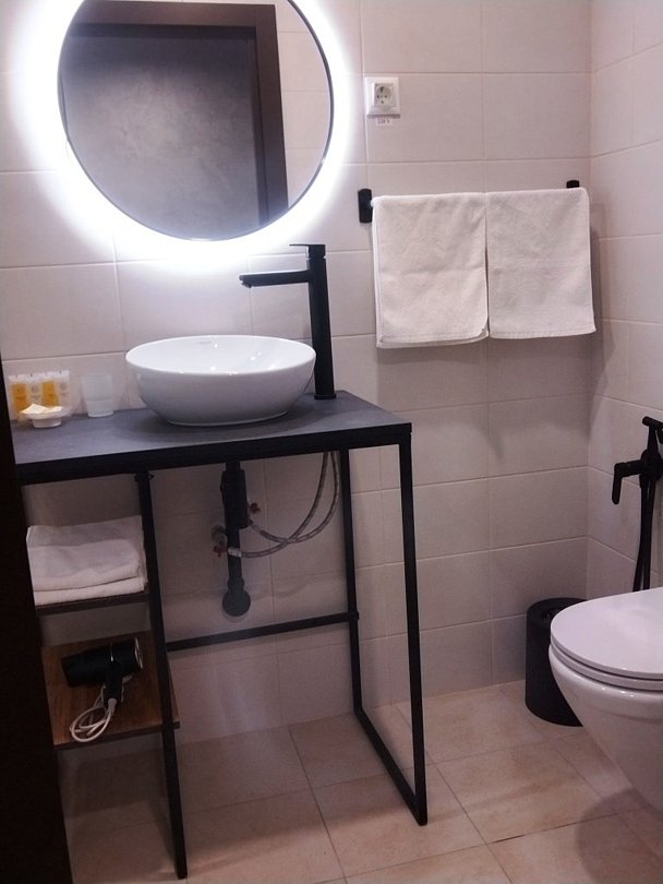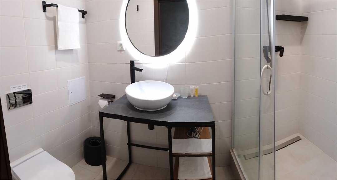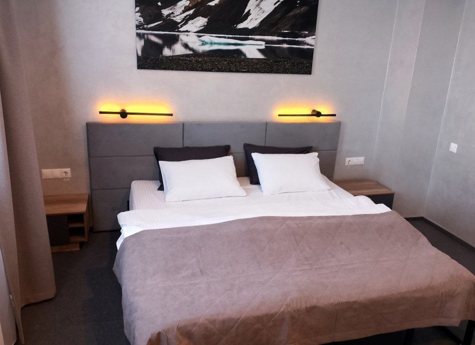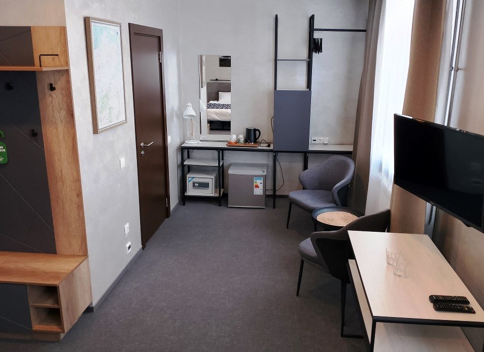 Просторный 1-комнатный номер с двумя зонами: спальня и гостинная, отличается повышенной комфортностью и позволяет разместиться с максимальным удобством как индивидуальным туристам, так и семейным или дружеским компаниям. Номер имеет площадь 33 кв.м и вид на поселок. Номер оборудован большой двуспальной кроватью с ортопедическим матрасом, набором мягкой мебели, гардеробом с вешалками для одежды. Имеется рабочий стол, стул, телевизор с плоским экраном, мини-холодильник, сейф. Санузел оборудован ванной, раковиной, унитазом, биде. Гостям предлагается набор полотенец и средств индивидуальной гигиены, а также фен.Услуги и удобства
