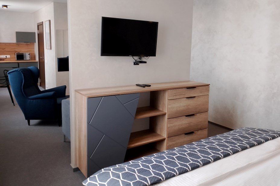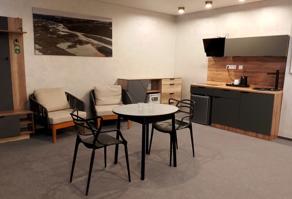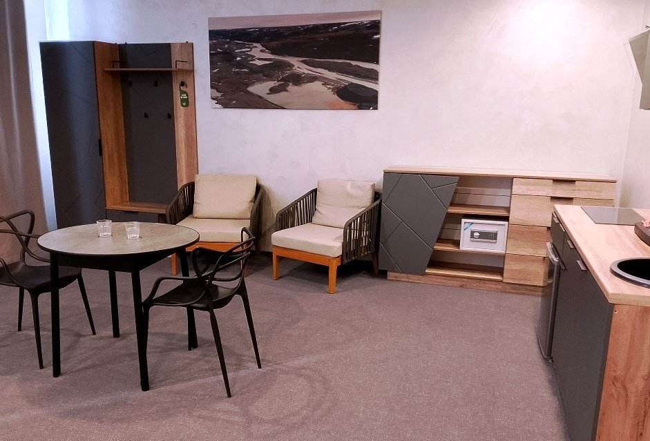 Апартамент с кухней - просторный однокомнатный номер с выделенной зоной спальни и мягкой зоной. Для удобства гостей имеется обеденный уголок, система хранения вещей и багажа, рабочий стол, телевизор с плоским экраном, сейф. В ванной комнате имеется фен, набор полотенец, средства личной гигиены.Услуги и удобства