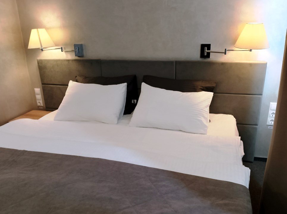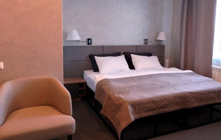 Просторный улучшенный стандартный номер площадью 20-22 кв.м с видом на поселок. Номер оборудован большой двуспальной кроватью с ортопедическим матрасом, гардеробом с вешалками для одежды. Имеется рабочий стол, стул, телевизор с плоским экраном, мини-холодильник, сейф. Ванная комната оборудована душевой, раковиной, унитазом. Гостям предлагается набор полотенец и средств индивидуальной гигиены, а также фен.Услуги и удобства