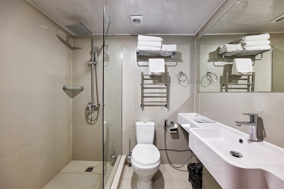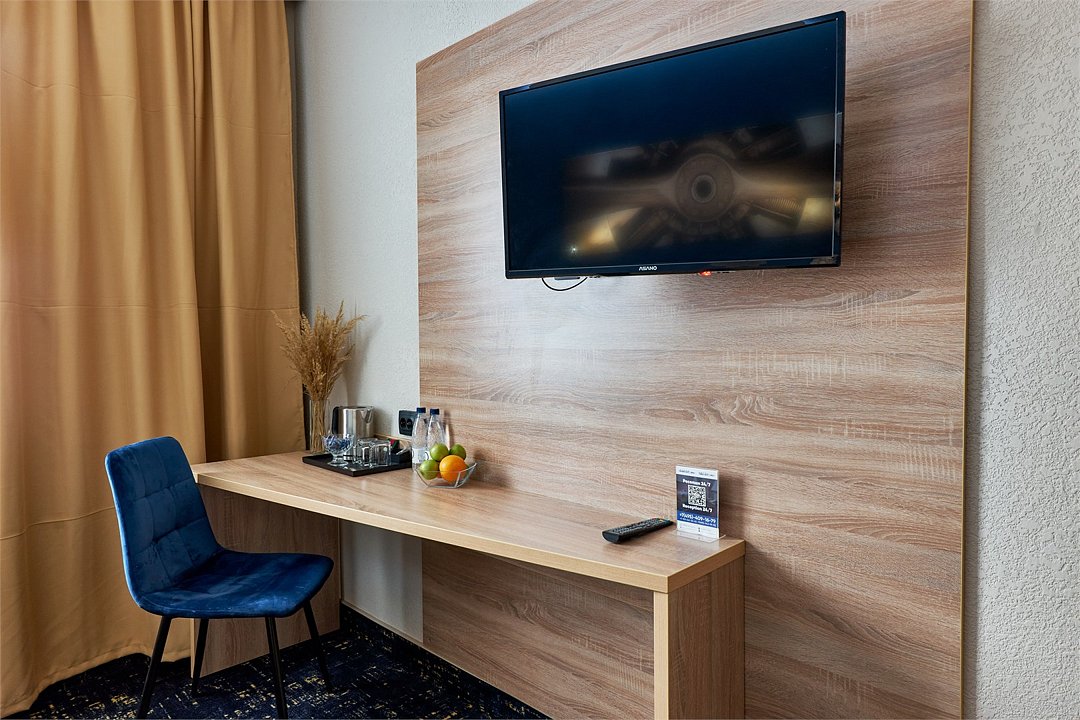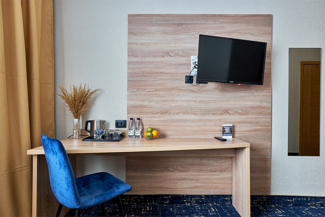 кабельное телевидение, Wi-Fi, светильник, настольные лампы, фен, биде, халаты, банные полотенца, тапочки, косметические средства, две полутораспальные кровати, две односпальные или большая двуспальная кровать, тумбы, вешалки, письменный стол, багажная тумба, зеркало, мини-бар, обслуживание номеров, информационная карта, меню, унитаз, раковина, ковровое покрытие, отопление, душ, кулер на этаже, кресло, вид во двор, стаканы, стол, туалетные средства, телевизор с плоским экраном, мини-холодильникВ гостиничном номере