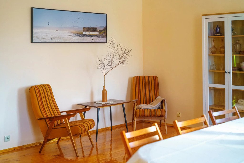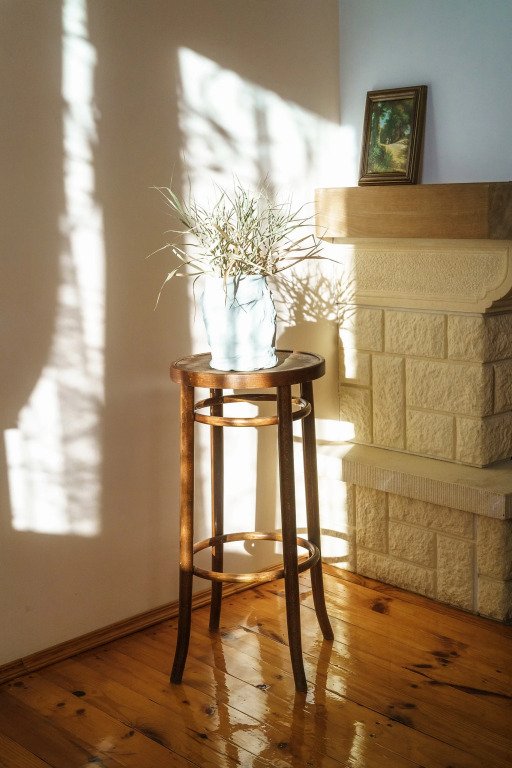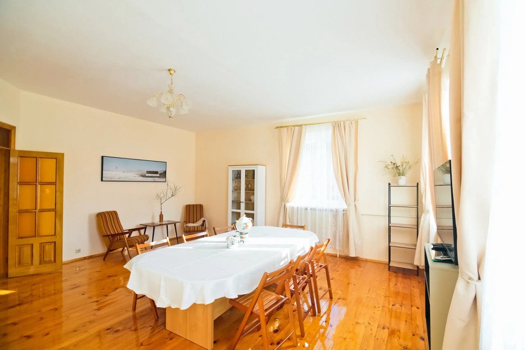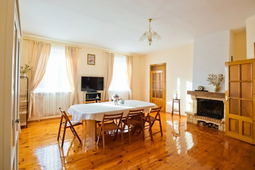 1 этаж: каминная со столом, гдe могут разместиться дo 10 гocтей, можно добавить стол и стулья по предварительному запросу; доступны праздничные фужеры, скатерть, телевизор, камин на дровах.