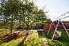 Также есть двор, украшенный уличными лампами-гирляндами. Во дворе: деревянный стол с скамейками, качели, зона барбекю: мангал и печь для казана, крытая беседка, сад, плодовые деревья, пруд, огород, парковка на несколько машин. Гостям предоставляются шампура и казан по предварительному согласованию и за дополнительную плату. Есть место под шатёр для гостей.