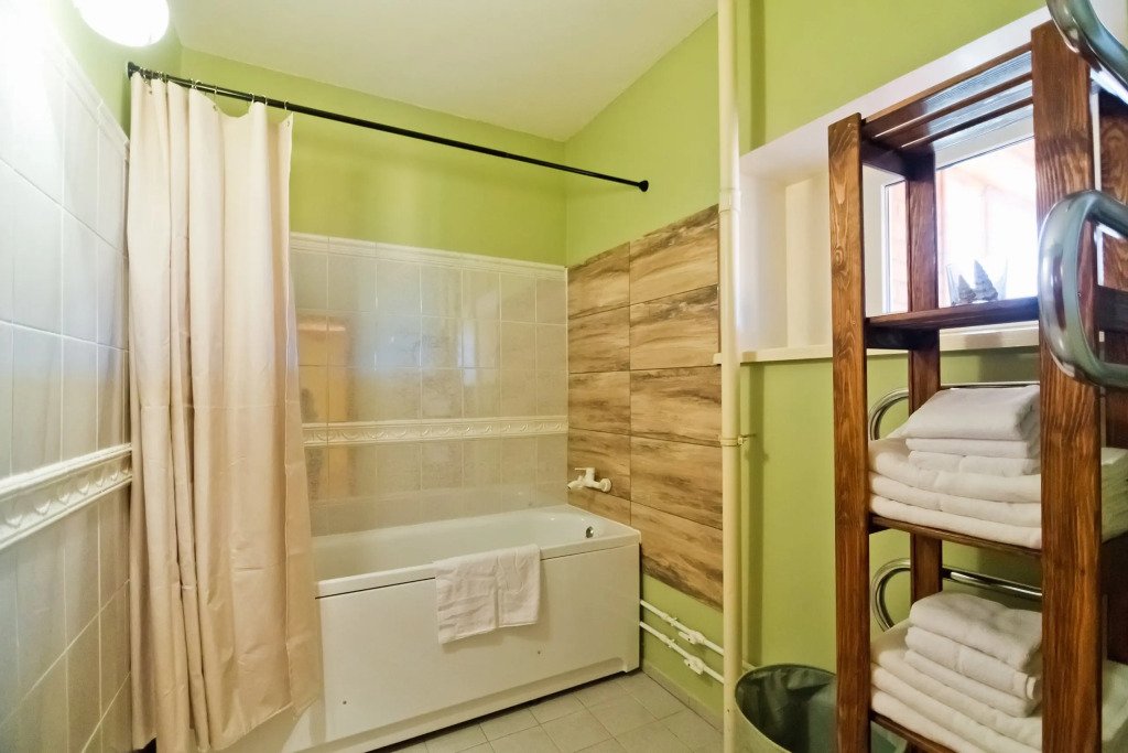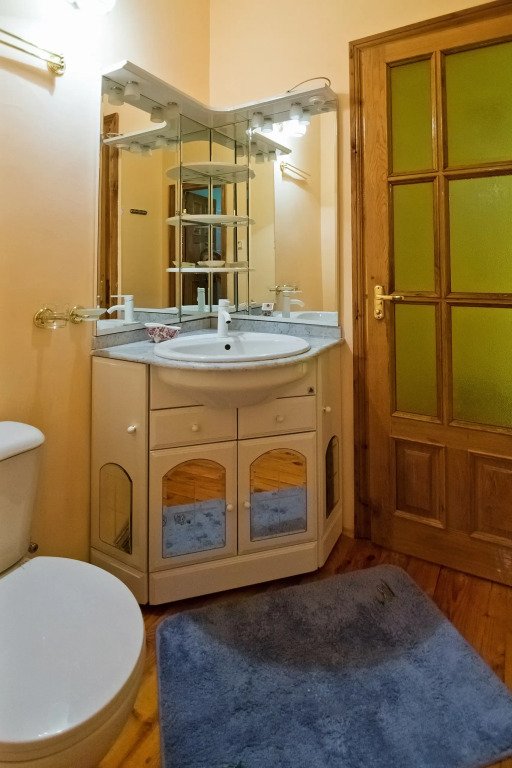 На двух этажах по 1 санузлу с гигиеническими принадлежностями: полотенца для лица, тела и ног, мыло, гели, шампуни, фен; утюг и гладильная доска по запросу.
