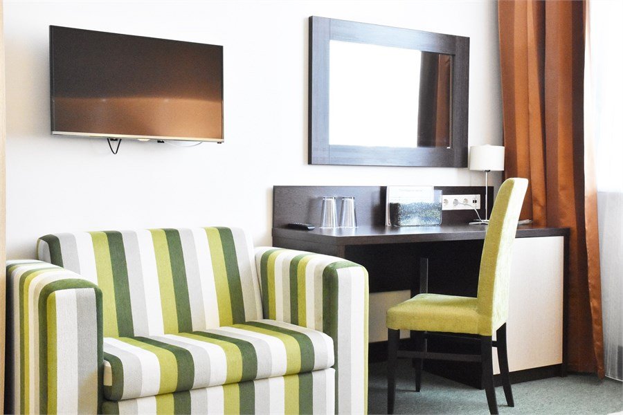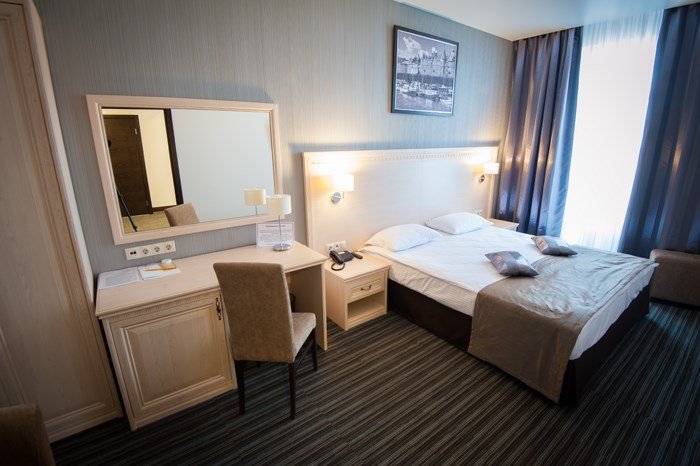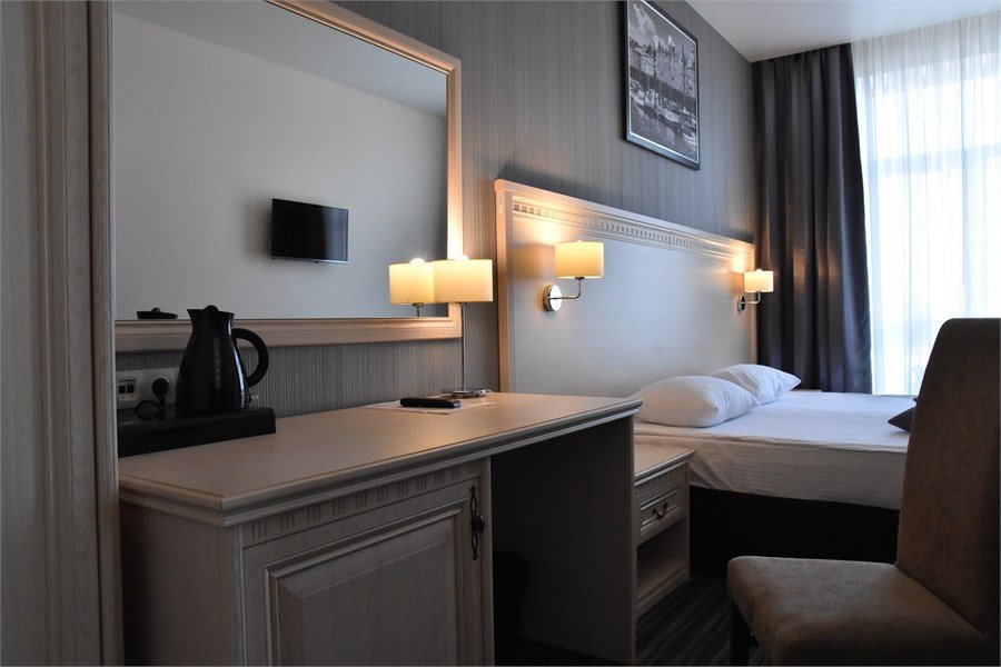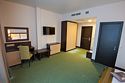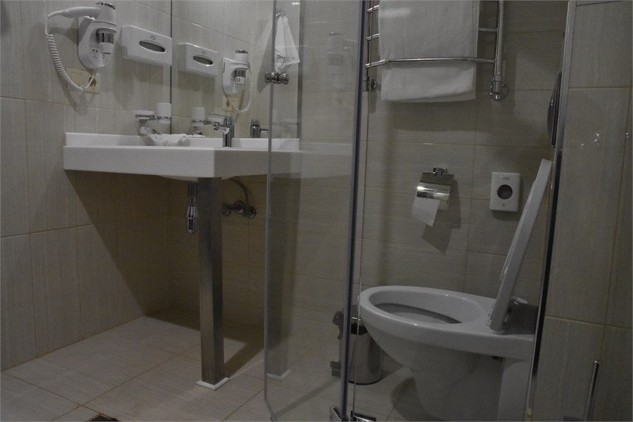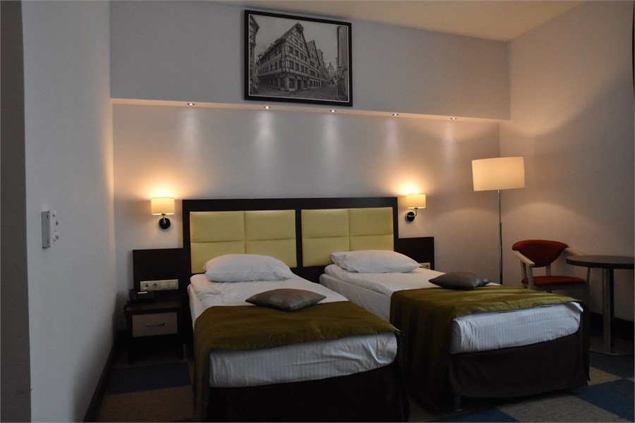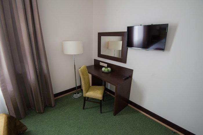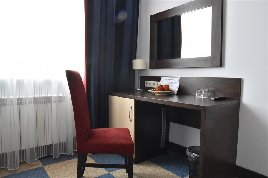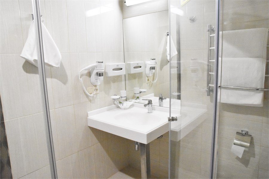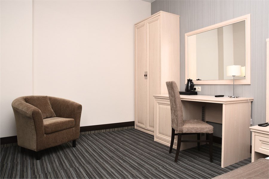 кабельное телевидение, Wi-Fi, телефон, холодильник, кондиционер, светильник, настольные лампы, фен, электронные замки, утюг, душевая кабина, халаты, банные полотенца, тапочки, гигиенические средства, косметические средства, две односпальные или большая двуспальная кровать, гладильная доска, тумбы, стулья, шкаф для одежды, вешалки, журнальный столик, письменный стол, багажная тумба, зеркало, комод, чайный набор, информационная карта, меню, сейф, унитаз, раковина, питьевая вода, ковровое покрытие, душ, вид на город, кулер на этаже, кресло, центральное кондиционирование, общая ванная комната, без питомцевВ гостиничном номере