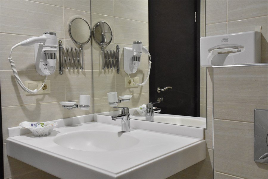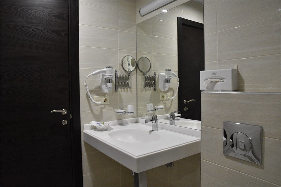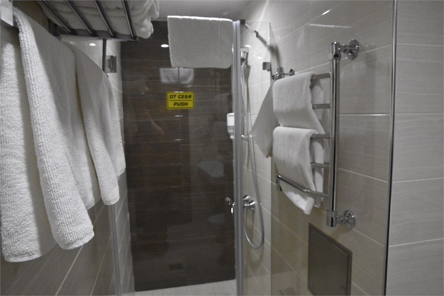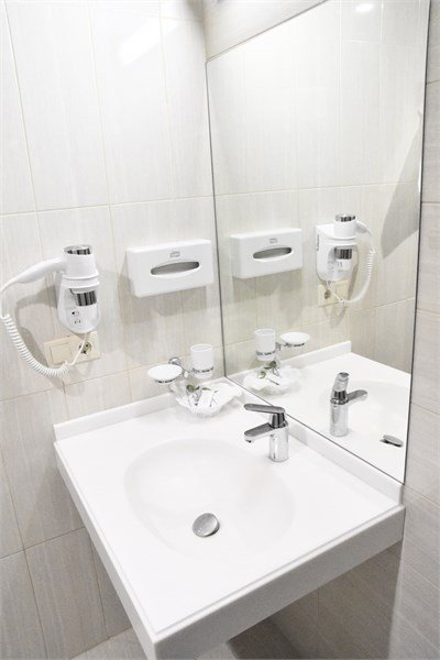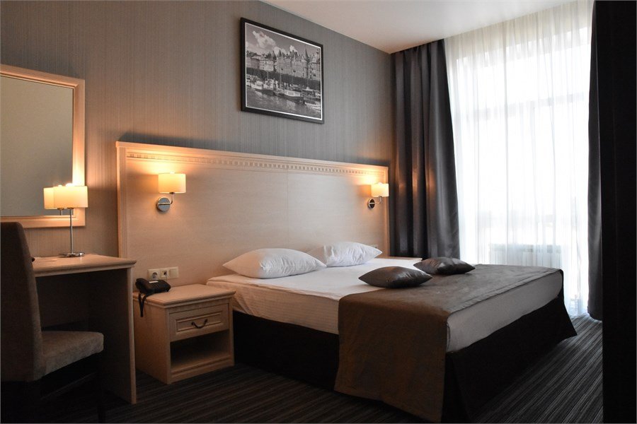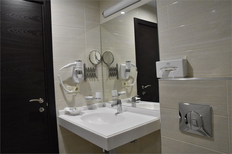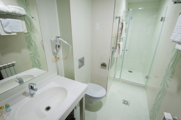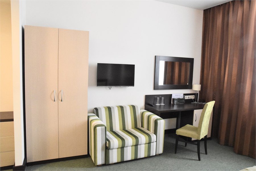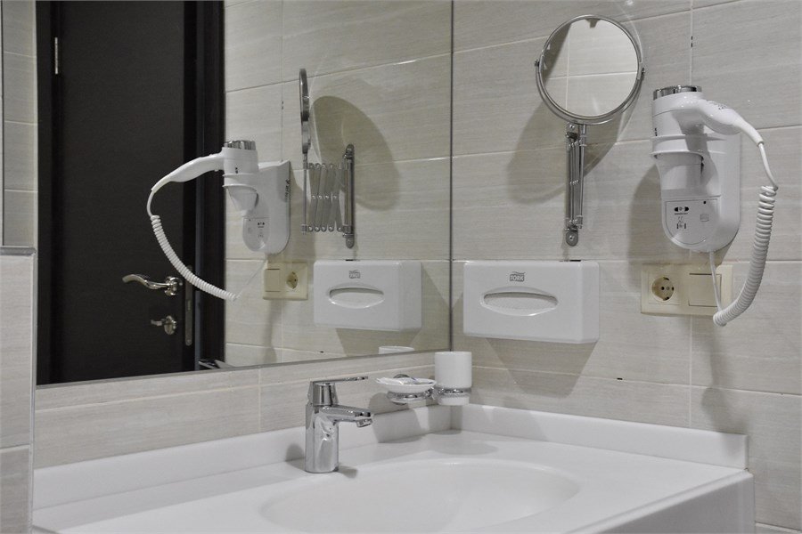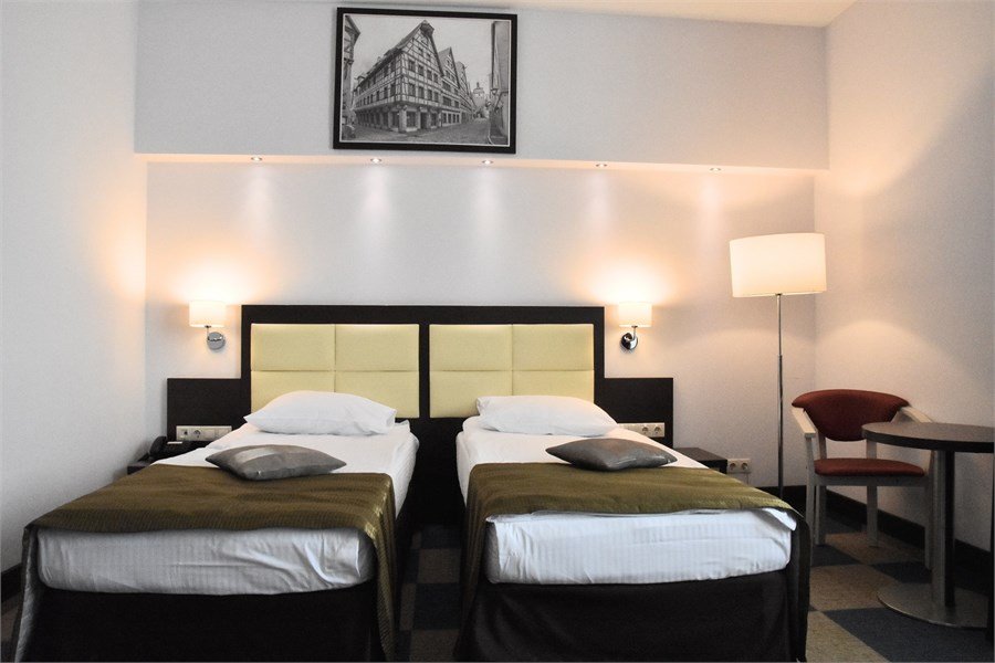 кабельное телевидение, Wi-Fi, телефон, холодильник, кондиционер, светильник, настольные лампы, фен, электронные замки, утюг, душевая кабина, халаты, банные полотенца, тапочки, гигиенические средства, косметические средства, две односпальные или большая двуспальная кровать, гладильная доска, тумбы, стулья, шкаф для одежды, вешалки, журнальный столик, письменный стол, багажная тумба, зеркало, комод, чайный набор, информационная карта, меню, сейф, унитаз, раковина, питьевая вода, ковровое покрытие, душ, вид на город, кулер на этаже, кресло, центральное кондиционирование, общая ванная комната, без питомцевВ гостиничном номере