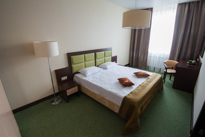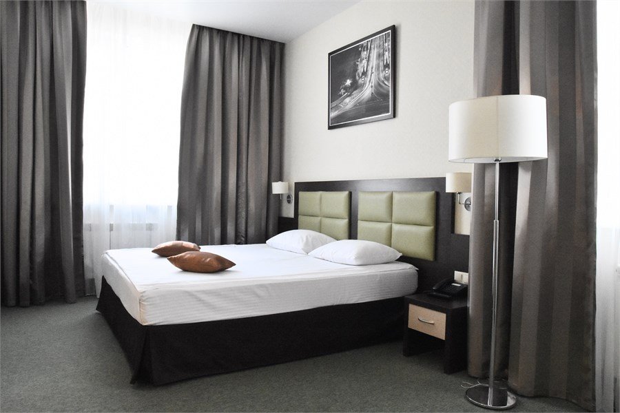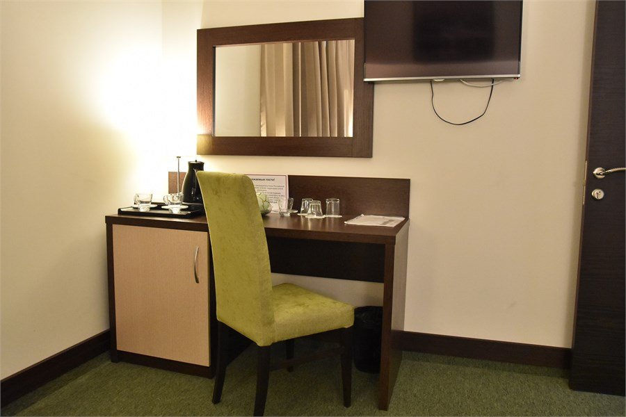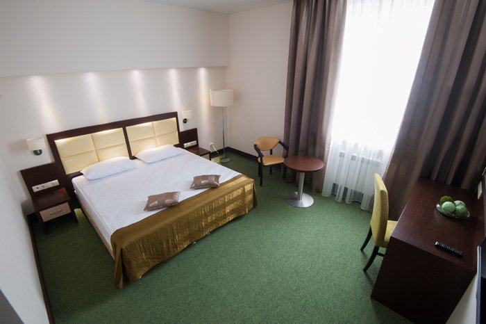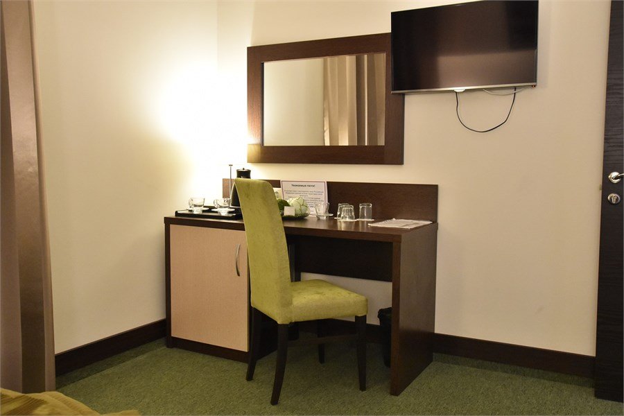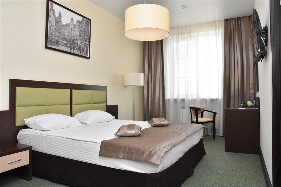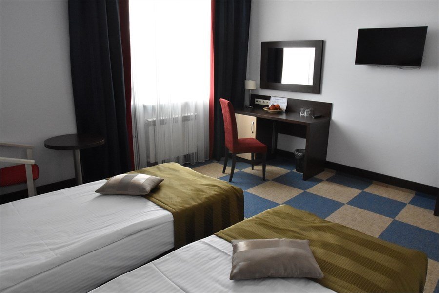 телевизор, спутниковое телевидение, Wi-Fi, телефон, холодильник, кондиционер, светильник, настольные лампы, фен, электронные замки, утюг, двуспальная кровать, гладильная доска, ортопедический матрас, тумбы, шкаф для одежды, зеркало, чайник, унитаз, косметическое зеркало, питьевая вода, ковровое покрытие, отопление, вид на город, кулер на этаже, центральное кондиционирование, общая ванная комната, без питомцевВ гостиничном номере