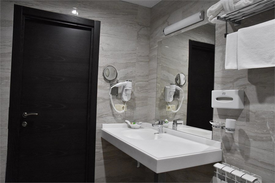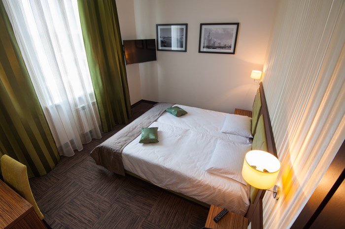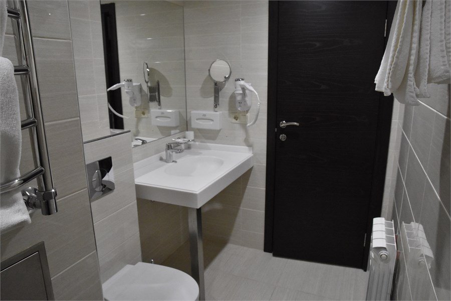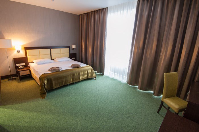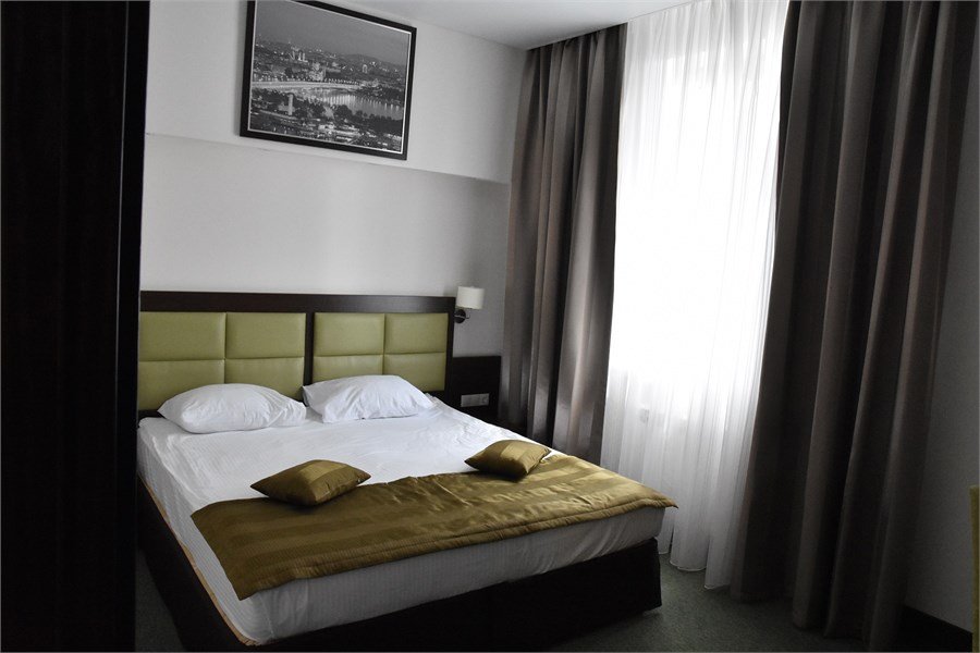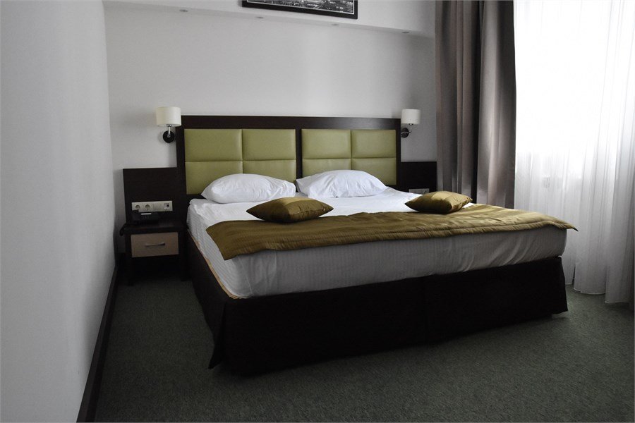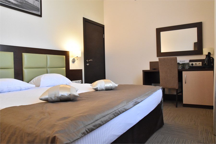 телевизор, спутниковое телевидение, Wi-Fi, телефон, холодильник, кондиционер, светильник, настольные лампы, фен, электронные замки, утюг, двуспальная кровать, гладильная доска, ортопедический матрас, тумбы, шкаф для одежды, зеркало, чайник, унитаз, косметическое зеркало, питьевая вода, ковровое покрытие, отопление, вид на город, кулер на этаже, центральное кондиционирование, общая ванная комната, без питомцевВ гостиничном номере