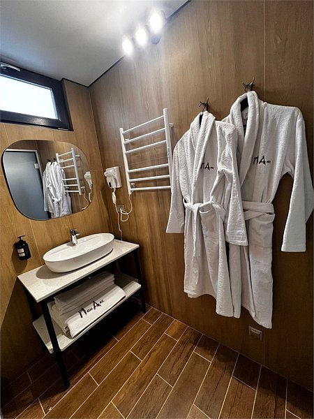 Санузел с душевой кабиной. Возле каждого номера расположена уютная зона отдыха с купольной беседкой, гриль-очагом.