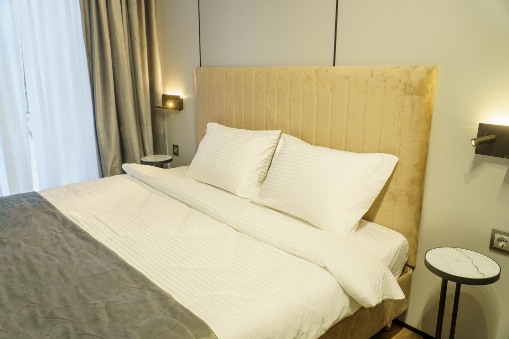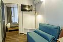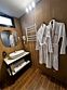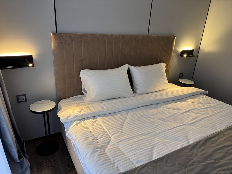 В номере две двуспальные кровати. Также есть мини-кухня. Номер укомплектован набором посуды, кофемашиной капсульного типа, чайным набором, кондиционером, полотенцами, халатами, феном, косметическими принадлежностями, сейфом.