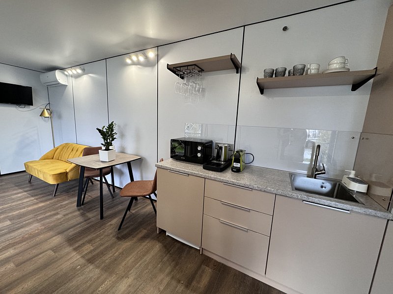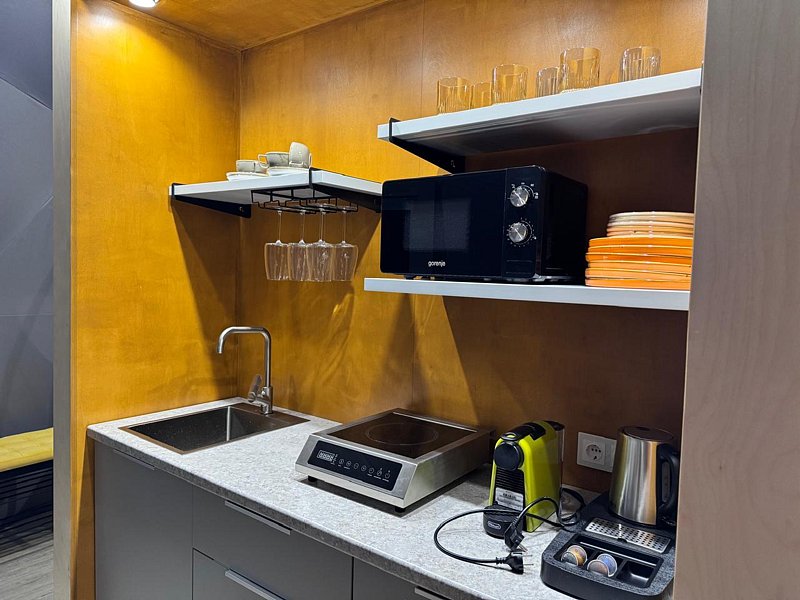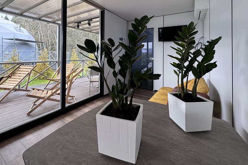 Современный домик, стильный и продуманный интерьер, площадью 30 кв. м. Внутри есть все необходимое для комфортного проживания: спальня с панорамным видом на лес, мини-кухня. Уютная зона отдыха, гриль-очаг.
