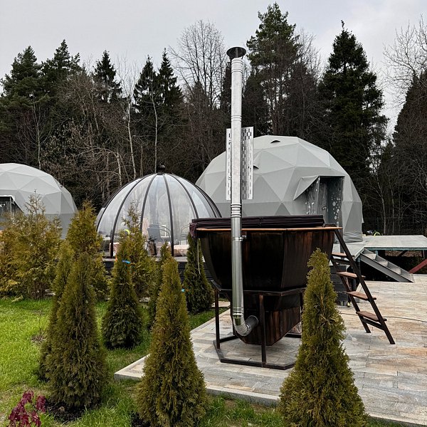 Главное отличие этого номера — сферическая форма и чан с подогревом. Уютный отдельно стоящий шатер-сфера оснащен большим панорамным окном с видом на лесную территорию. Комфортное проживание для небольшой семьи.