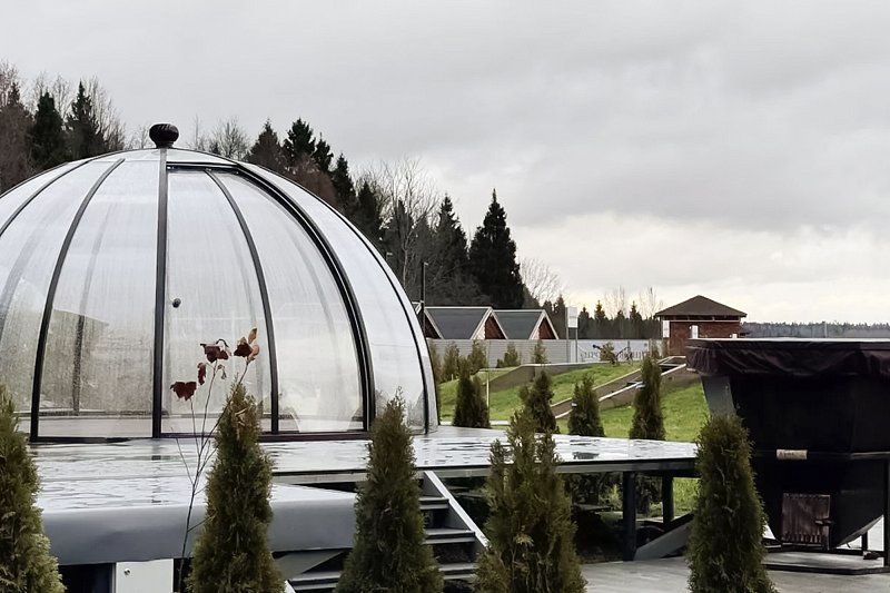 Рядом стоит небольшая сфера-беседка с мебелью для распития чая с круглогодичным отоплением.