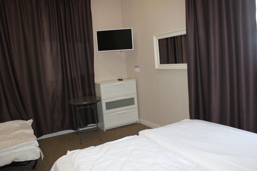 В номере одна двуспальная кровать, раскладной диван, ТВ, душ, туалет, стол, комод, окно во двор, Wi-fi.