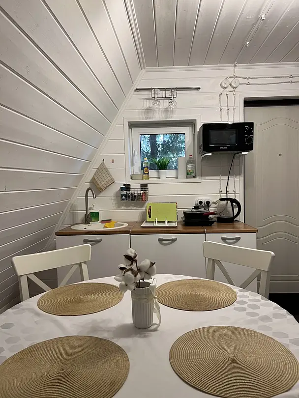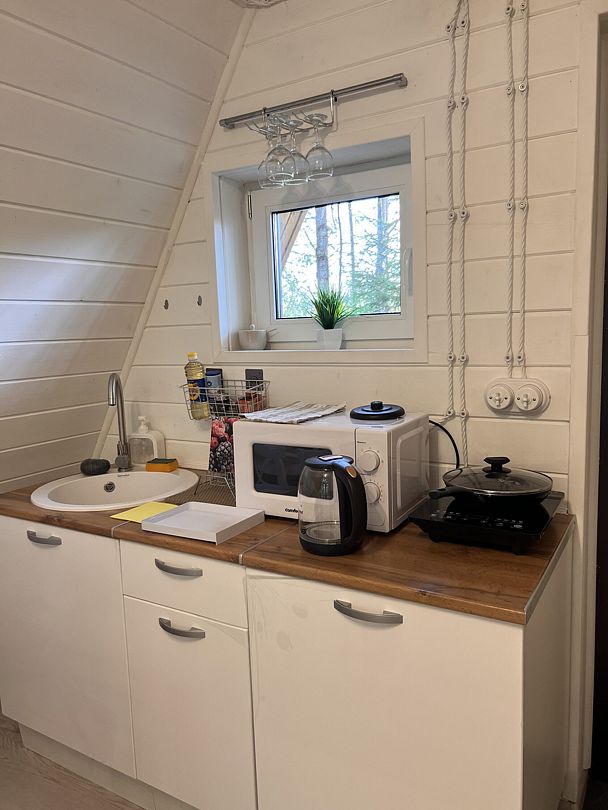- мини-кухня со всем необходимым (микроволновка, холодильник, варочная панель, посуда);