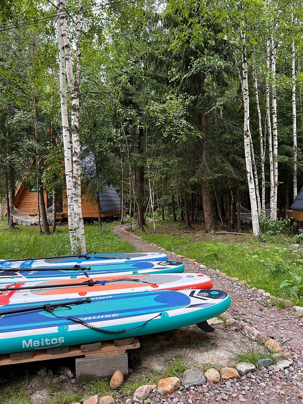 Гости могут насладиться тишиной и велосипедными прогулками в хвойном лесу, поиграть в настольные игры или заказать баню на дровах. Любителям активного отдыха в бесплатную аренду предоставляются сап-борды, резиновая лодка и рыболовные снасти. Дети могут весело провести время на детской площадке.