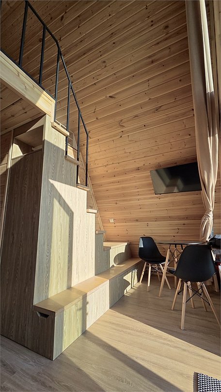 Добро пожаловать в уютный A-фрейм с панорамными окнами, идеально подходящий для комфортного отдыха на природе! Этот четырехместный номер предлагает вам уникальное сочетание современного дизайна и естественной красоты.