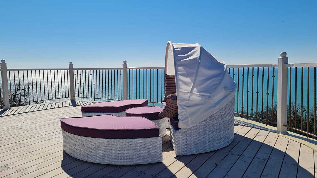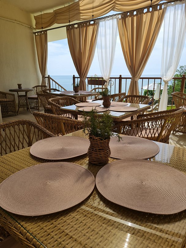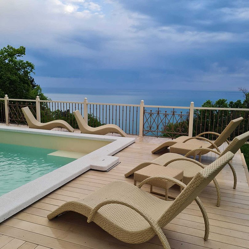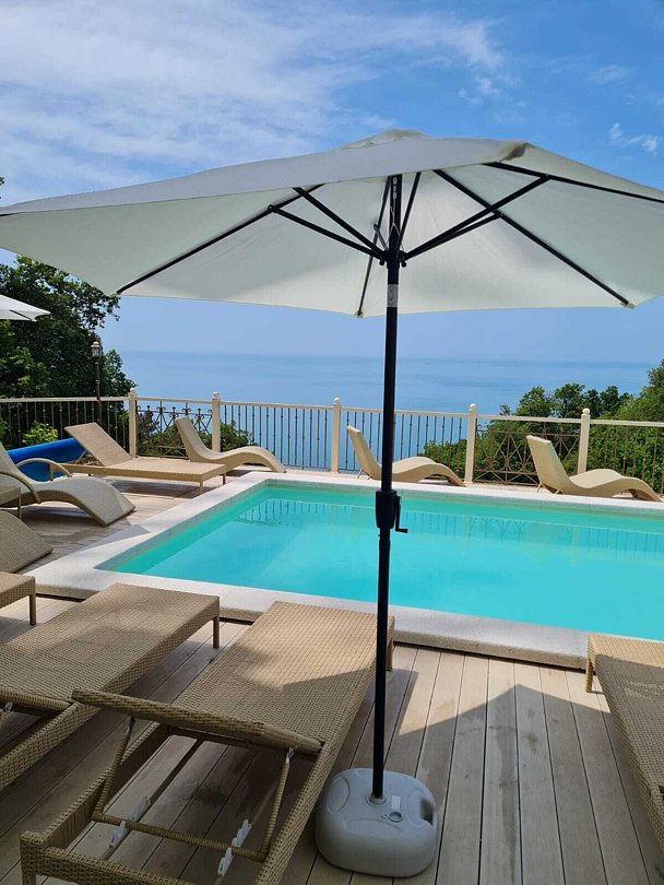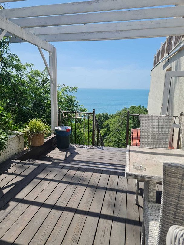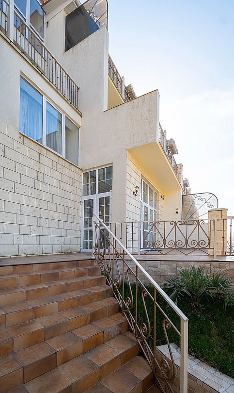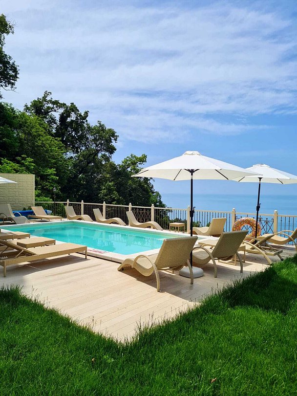 На благоустроенном цветущем участке возле дома есть бассейн, с комфортной температурой, действующий круглогодично. Вокруг бассейна можно позагорать на плетеных шезлонгах, любуясь видом открытого моря. Мангальная зона и принадлежности для барбекю позволят приготовить вкусный ужин. На летней террасе подается идеальный завтрак: свежеиспеченный круассан (сырники или блинчики) и ароматный кофе (сезонно). На территории гостевого дома есть Wi-Fi, предусмотрена неохраняемая закрытая парковка (по запросу).